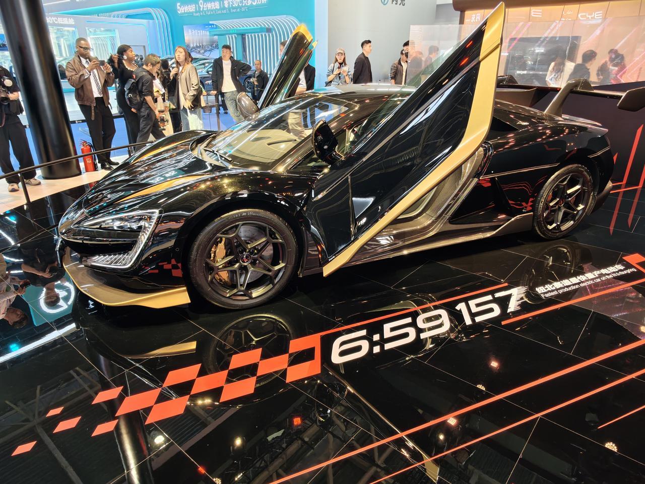 在比亚迪包馆的E3馆,这款车色的灵感吸引众多观众们的目光。它的来源其实是中国汽车的骄傲:U9X打破世界纪录的当天清晨,恰逢一道金色阳光冲破云层,中国汽车站在了榜单的Top 1,这是属于仰望的“破晓时刻”。展台上的“6′59″157”,就是它拿下纽北赛道全球量产车速度纪录的数据。