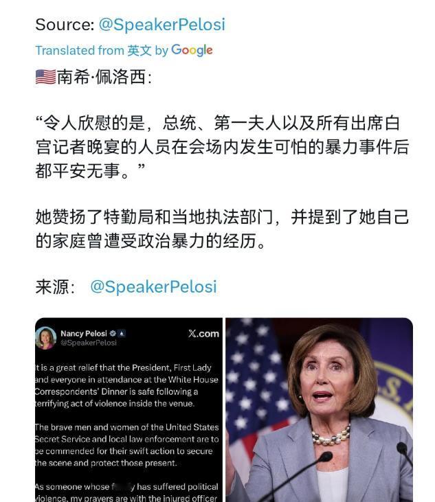 特朗普的死对头南希·佩洛西出来回应了!在枪击事件发生之后,佩洛西发表声明称,在这场发生在会场内的恶性暴力事件过后,总统、第一夫人以及出席白宫记者晚宴的所有人员均平安无事,这令人深感宽慰。