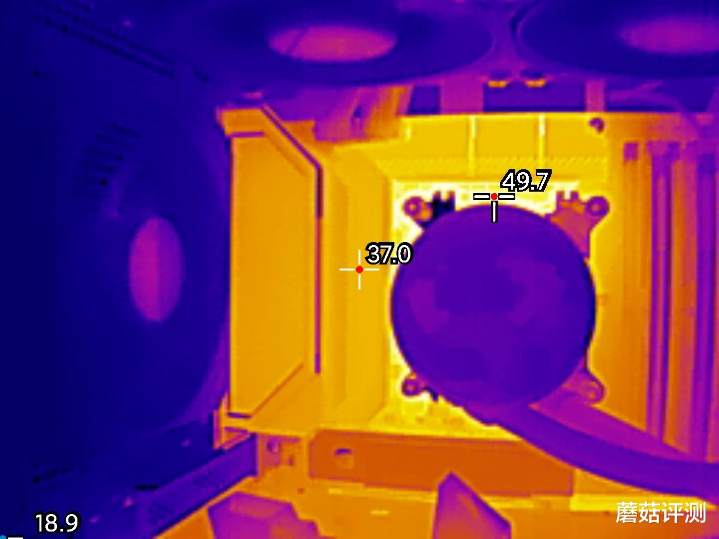 ▼主板供电模组整体温度表不错,左侧供电散热件表面温度37℃,热点温度在49.7℃左右。