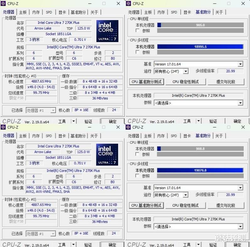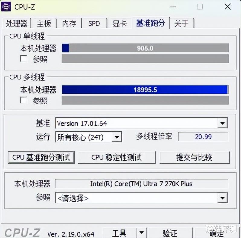 ▼简单跑个CPU-Z测试,单核得分905,多核得分18995.5,表现不错。