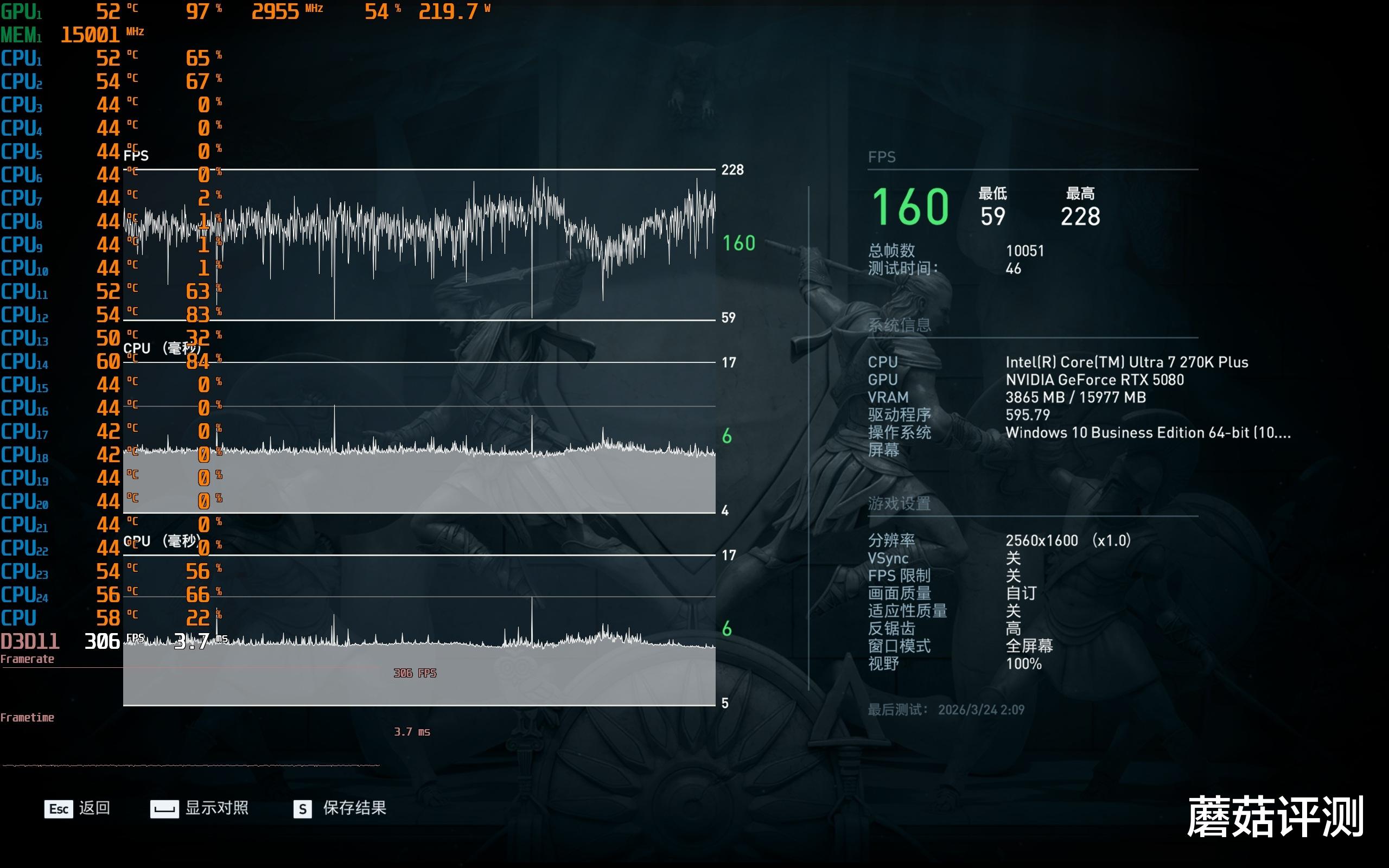 ▼众生平等奥德赛,2K分辨率,极高画质,体积云最低,平均游戏帧数从160帧提高到162帧。