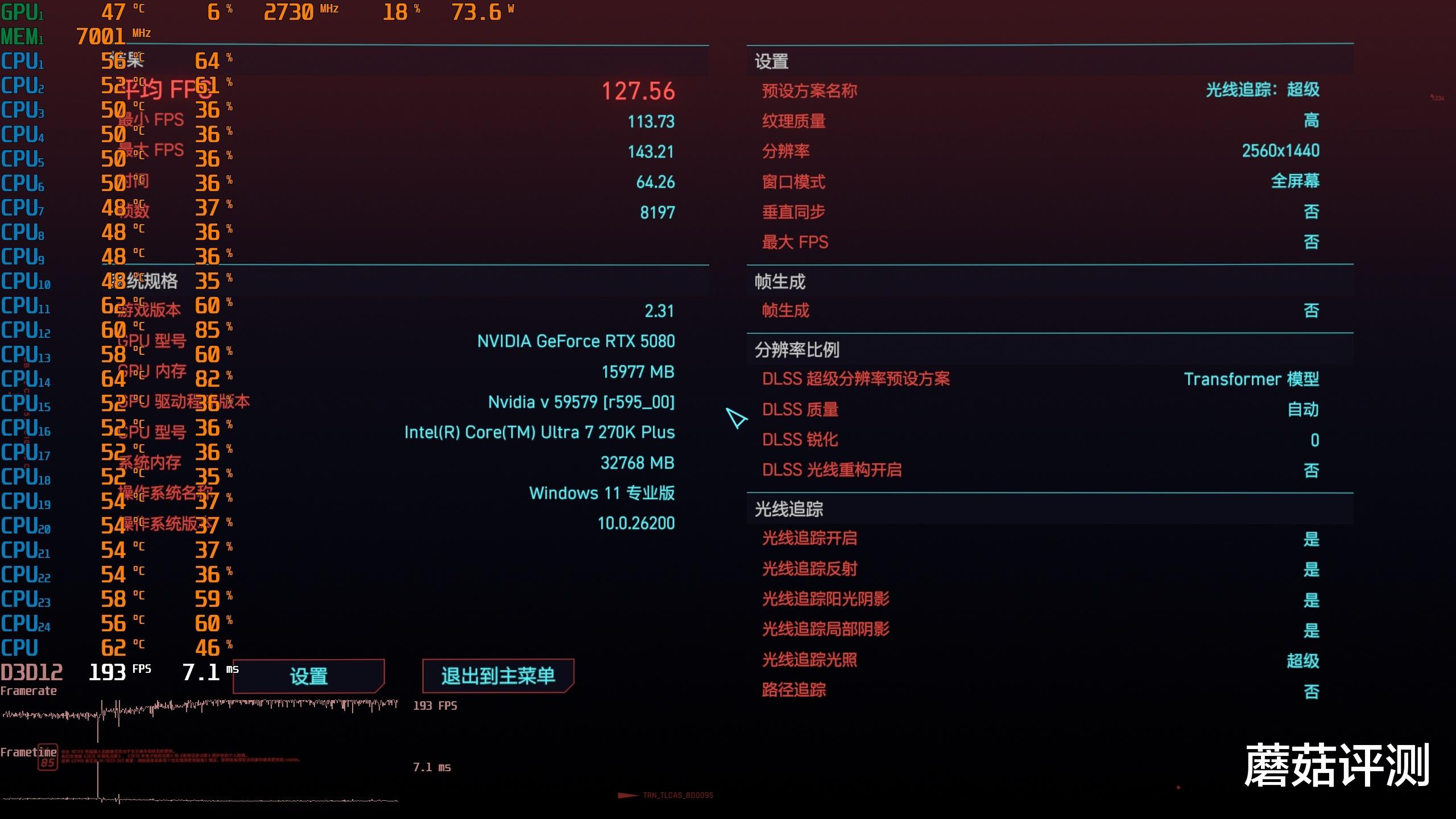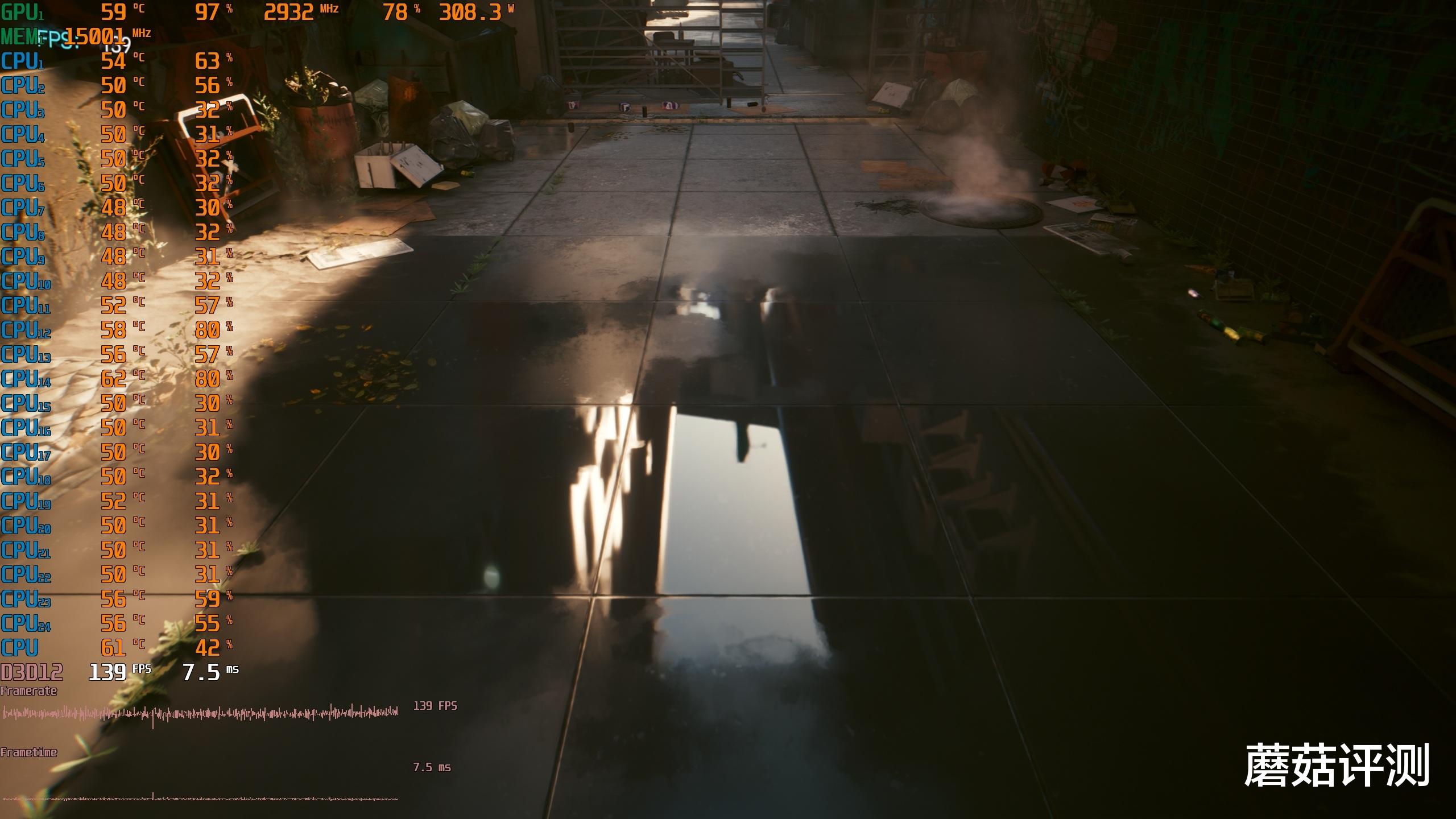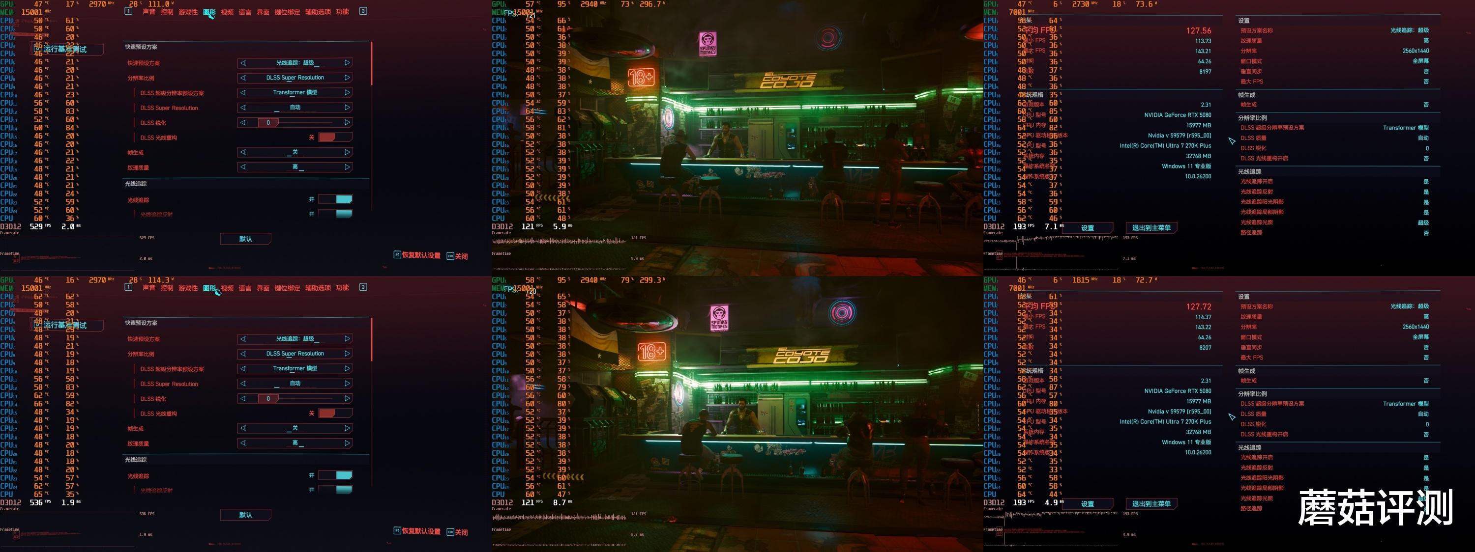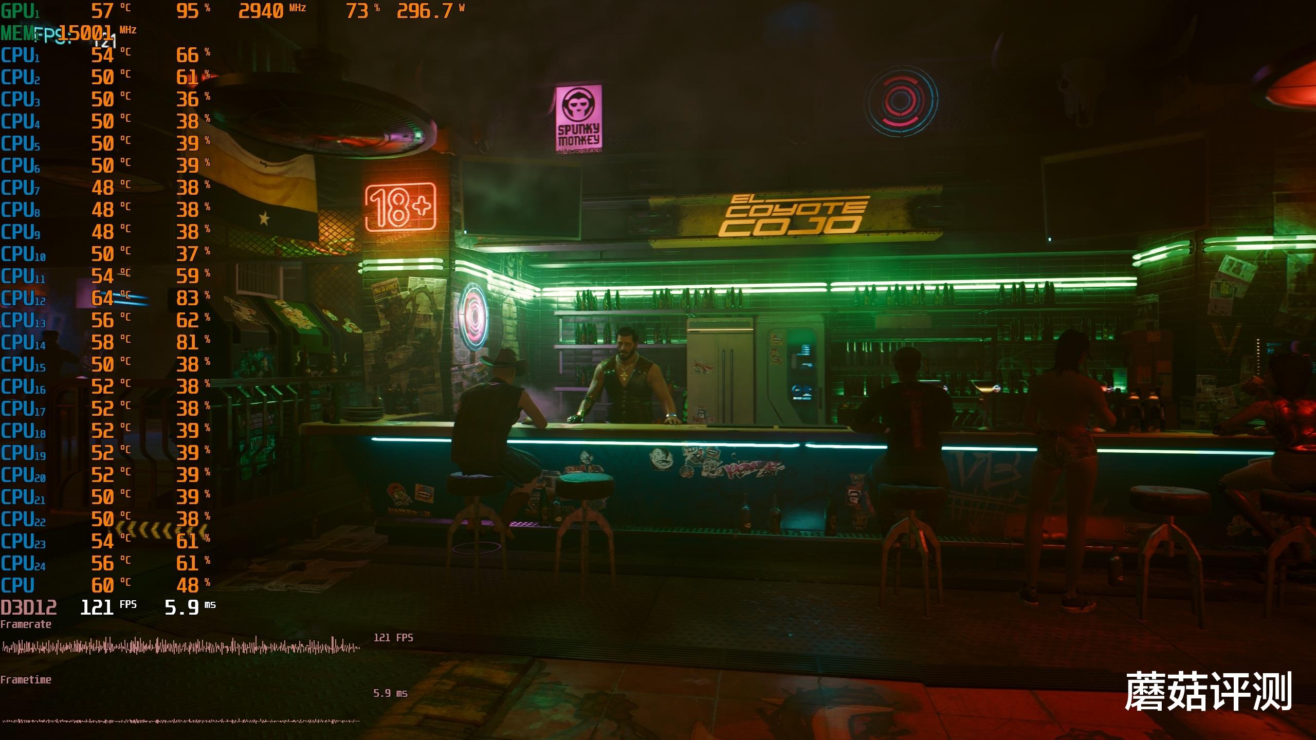 ▼赛博朋克2077,2K分辨率,光追超级画质,大力水手DLSS自动,拼好帧关闭。酒吧吧台游戏帧数121帧,室外水滩游戏帧数139,平均游戏帧数在127.56帧,表现不错。