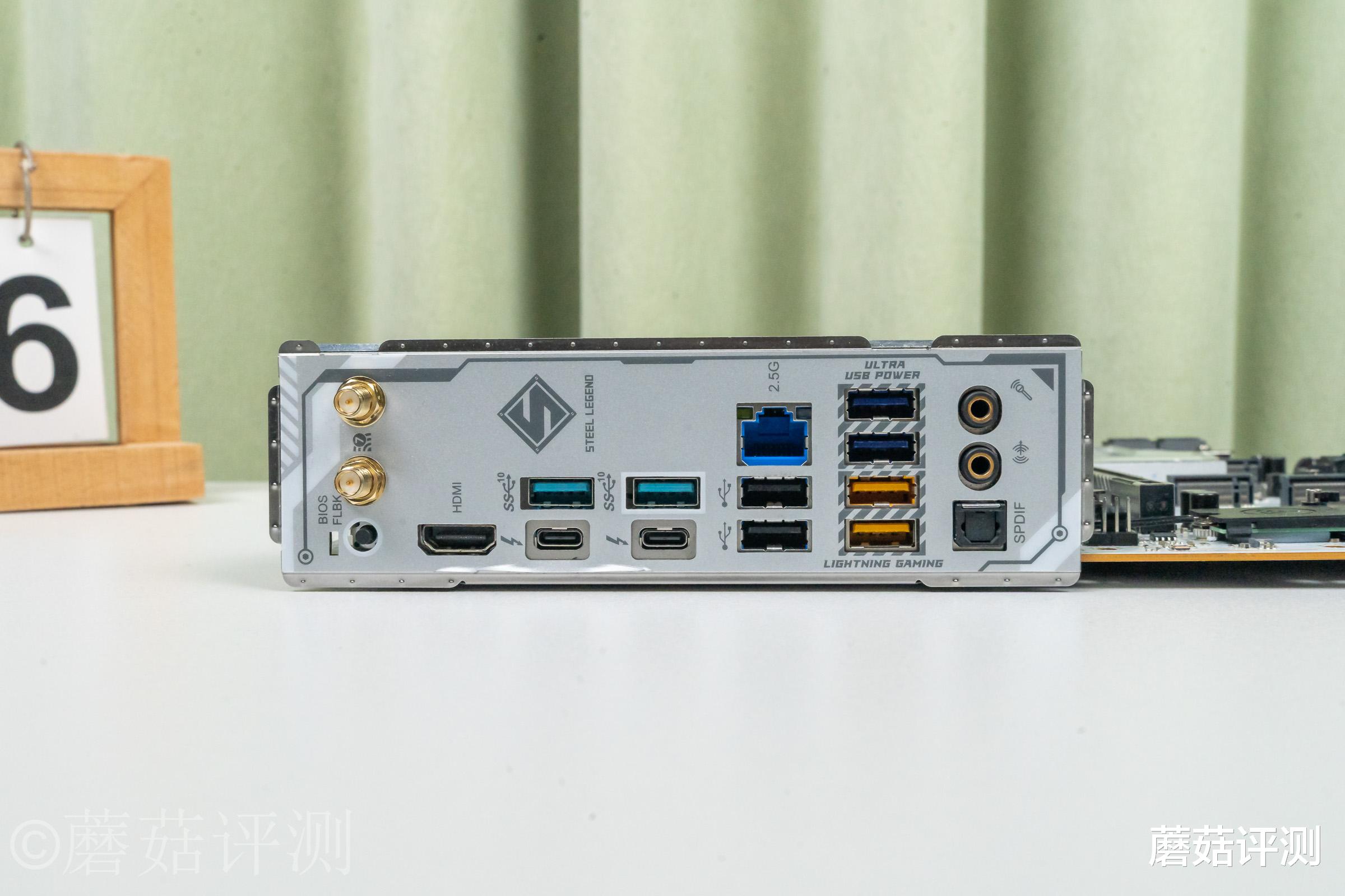 ▼主板后部的IO接口部分,两个雷电4接口非常显眼,另外还有两个Lightning电竞键鼠接口,以及两个Ultra USB POWER接口,这两个USB接口拥有更强大的供电能力,在应付一些高功耗的移动设备时会更加从容,例如移动机械硬盘、USB采集卡、USB声卡之类的。