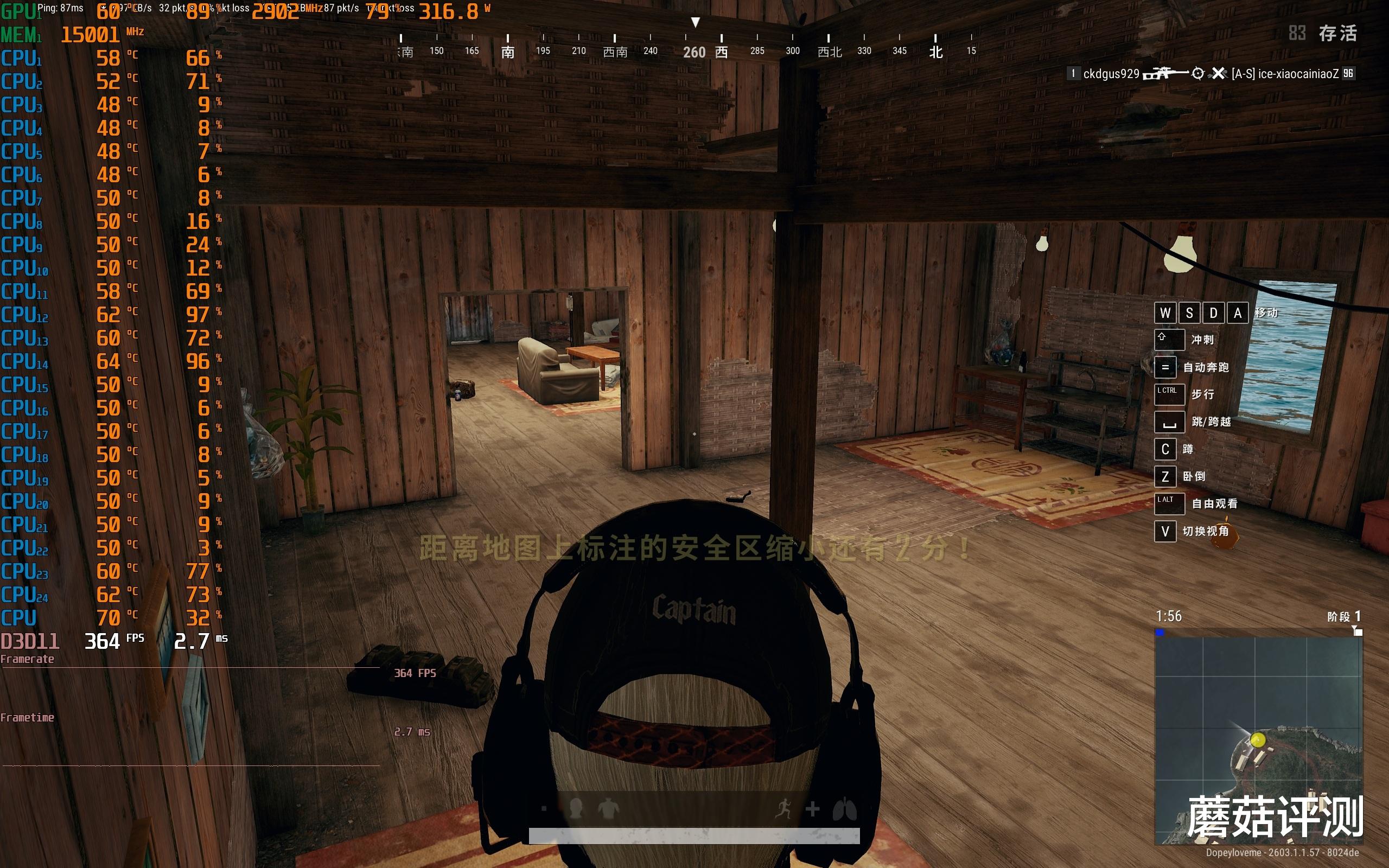 ▼绝地求生PUBG,2K分辨率,全高画质,室外游戏帧数在368帧左右,室内游戏帧数在364帧左右,表现不错。