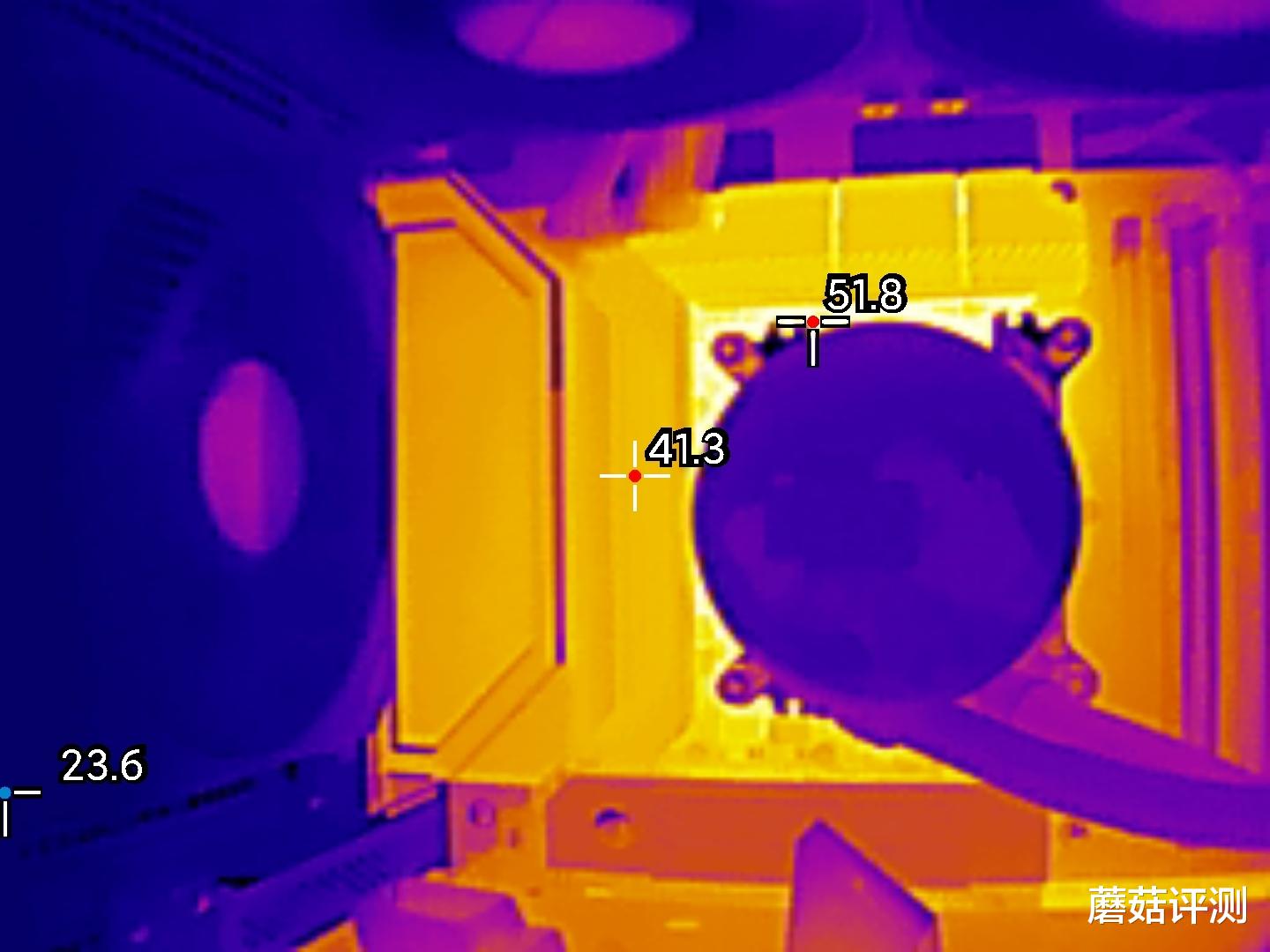 ▼主板供电左侧金属散热件温度在41.3℃,供电模组热点温度51.8℃,整体表现非常优秀。