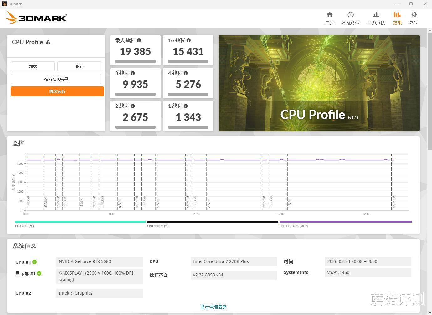 ▼跑个3Dmark的cpu测试,1线程得分1343,8线程得分9935,最大线程得分19385,分数都很高。