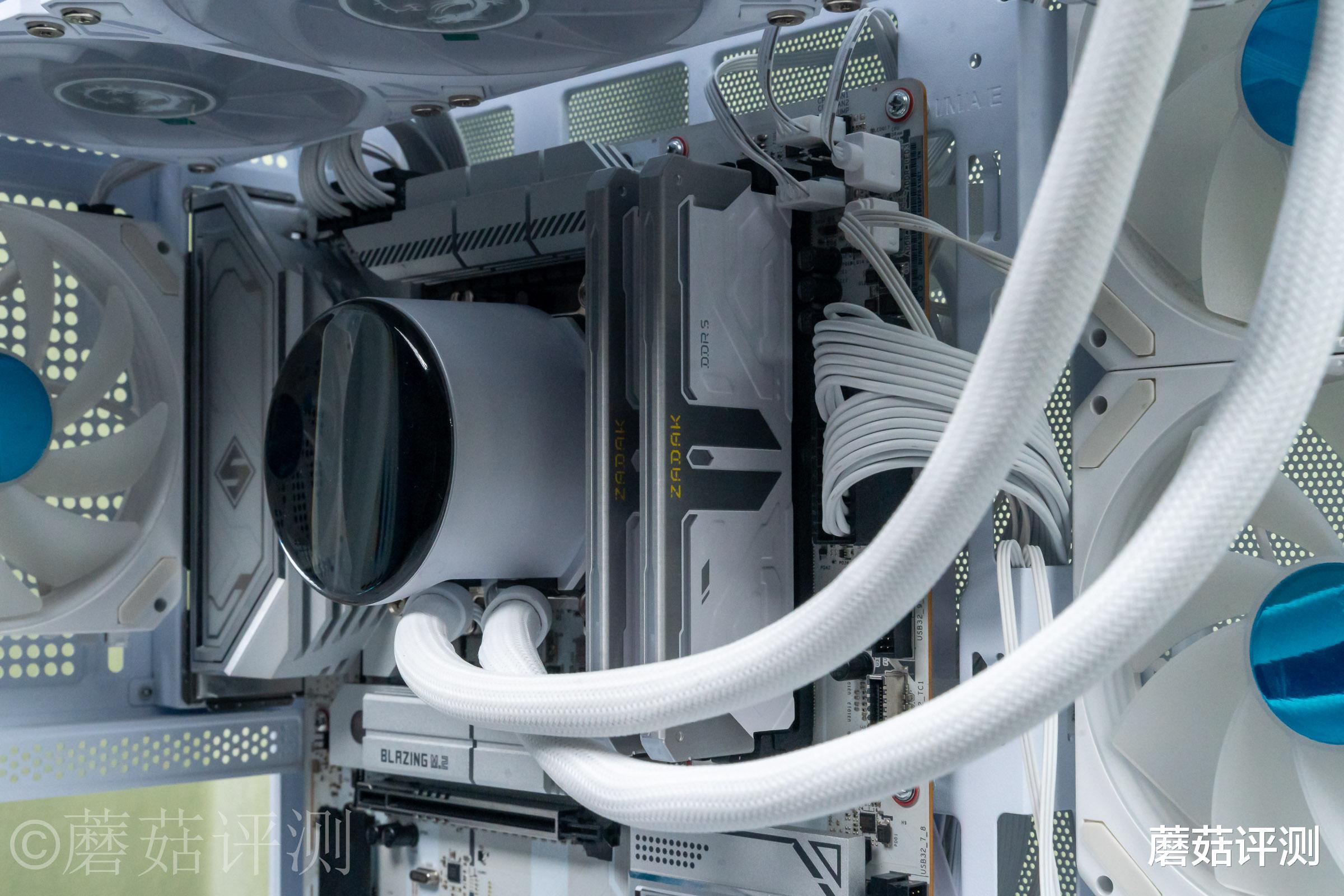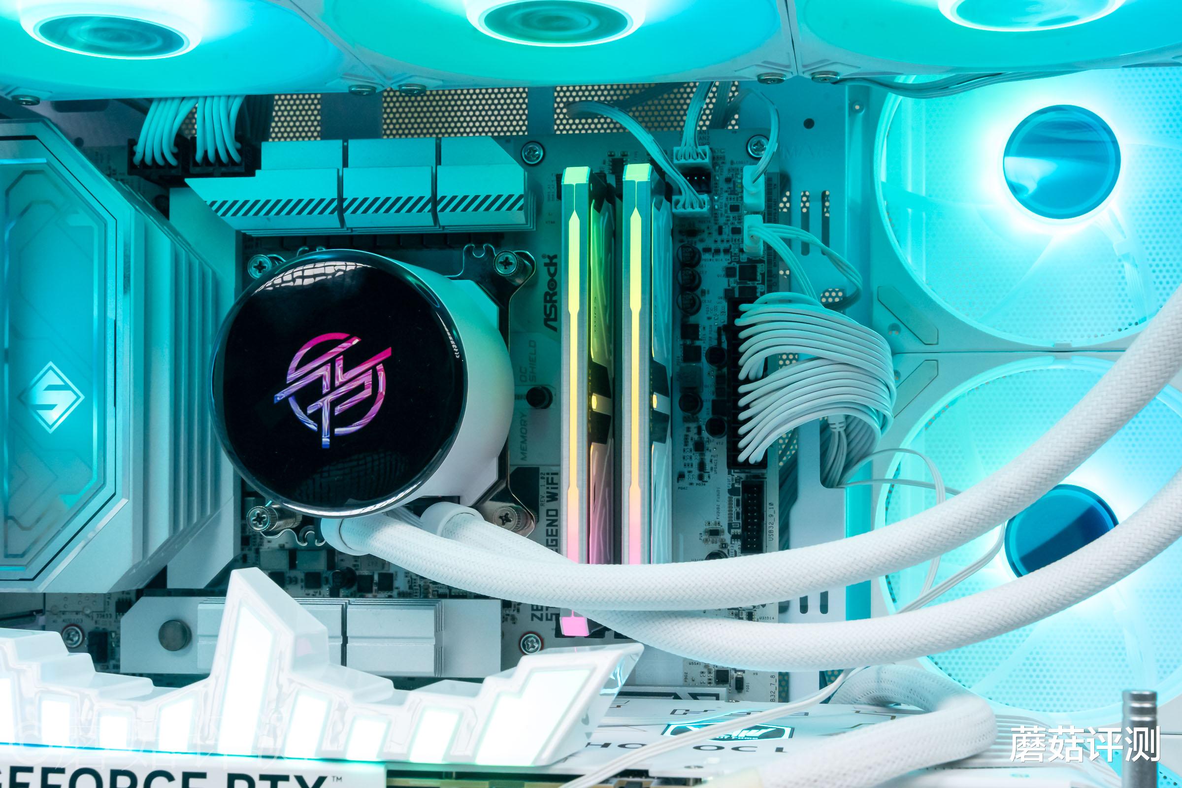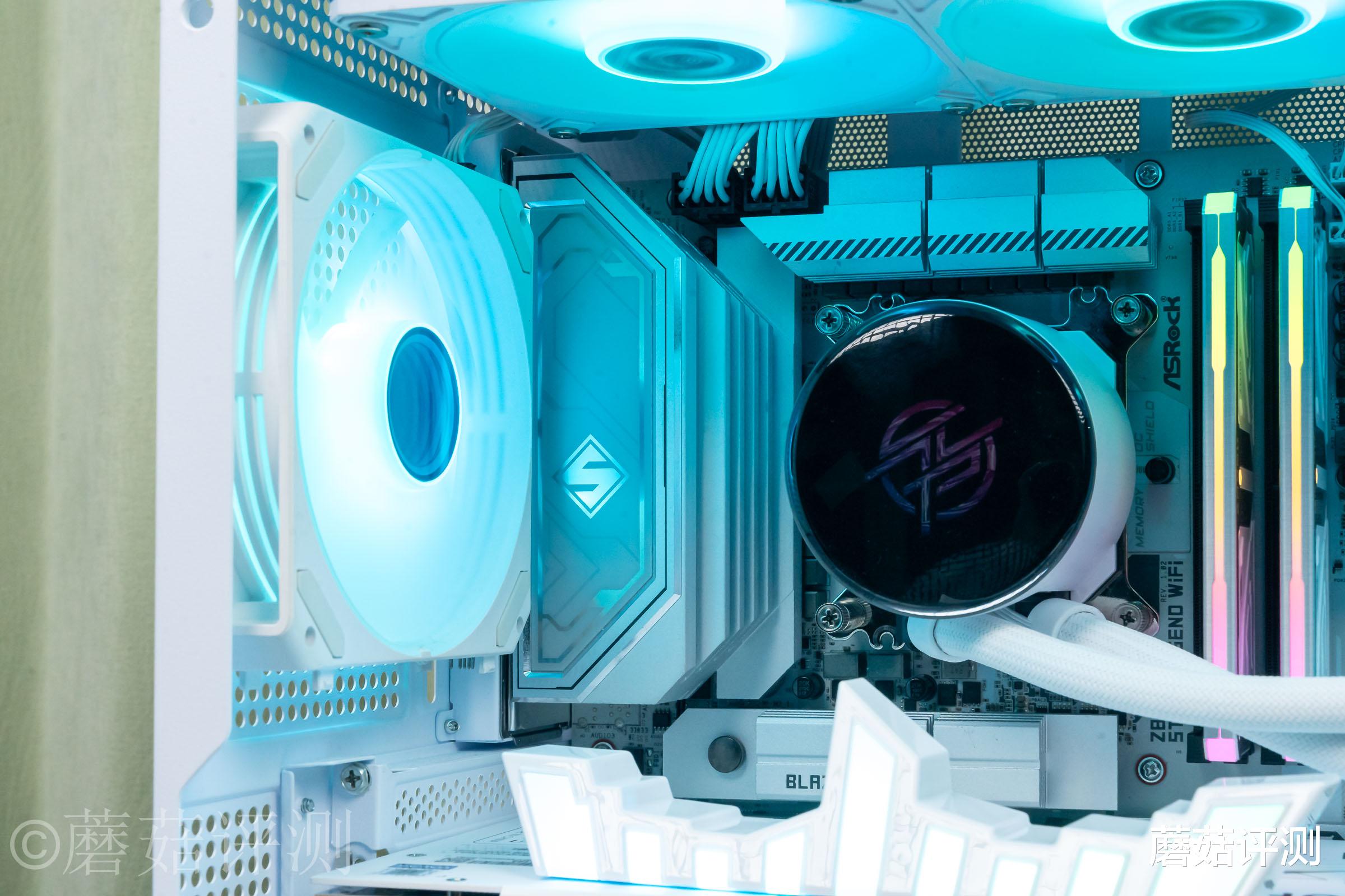 ▼然后搭配多段式RGB灯带,巧妙的融合到处理器的两种不同处理的金属马甲中间。