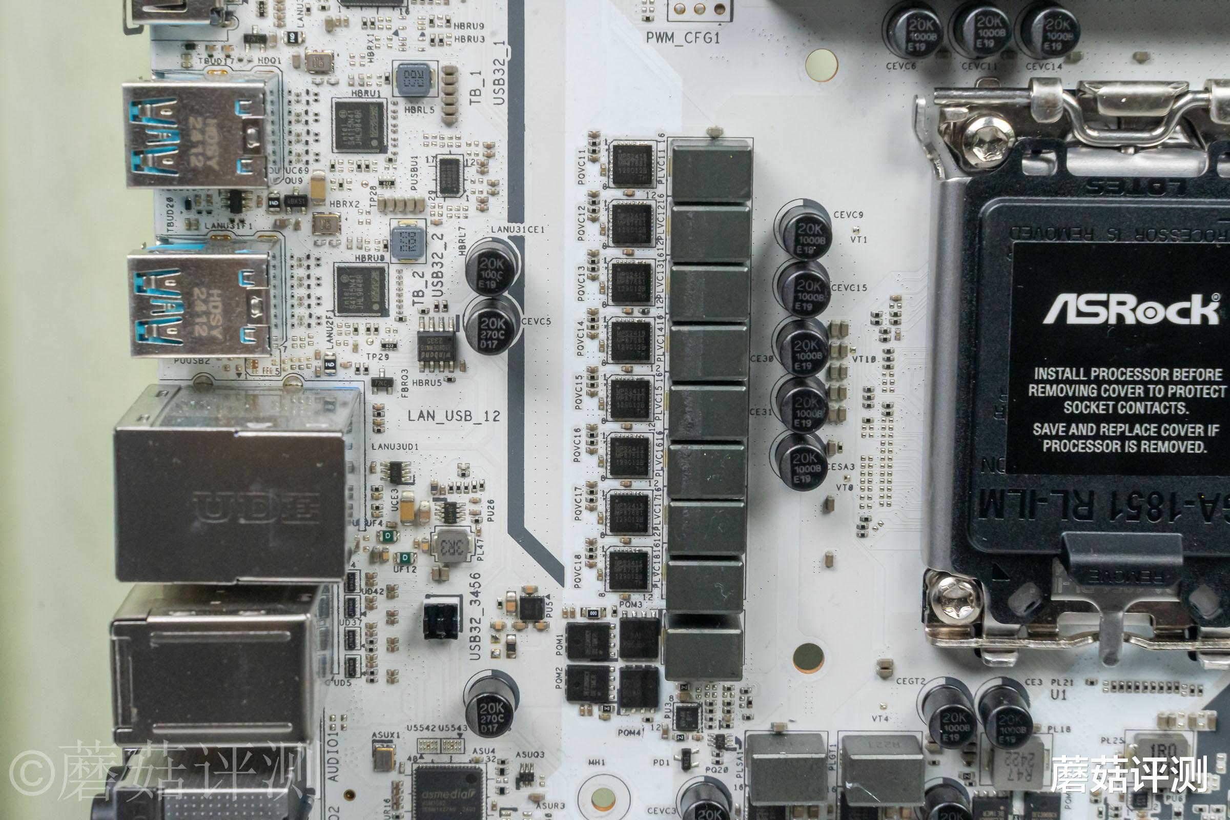 ▼处理器插座的左下角,还有两项供电,也是80A的DrMos,负责处理器的Vgt和Vsa供电。这块处理器的供电规格就是18+1+1+1,其中处理器的Vcore、Vgt、Vsa供电均为80A的DrMos,这套供电电路,无论是规格还是用料,都非常豪华。