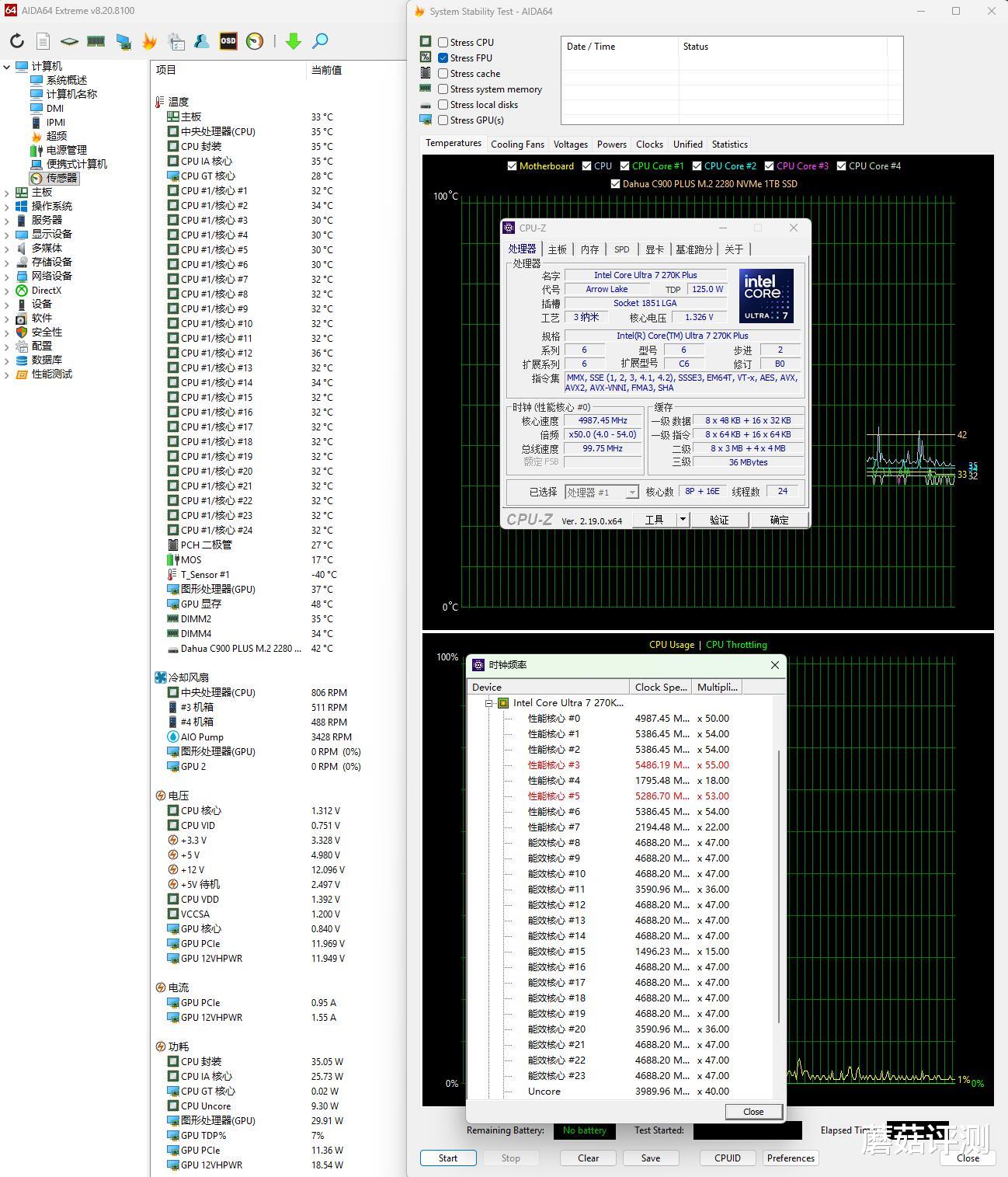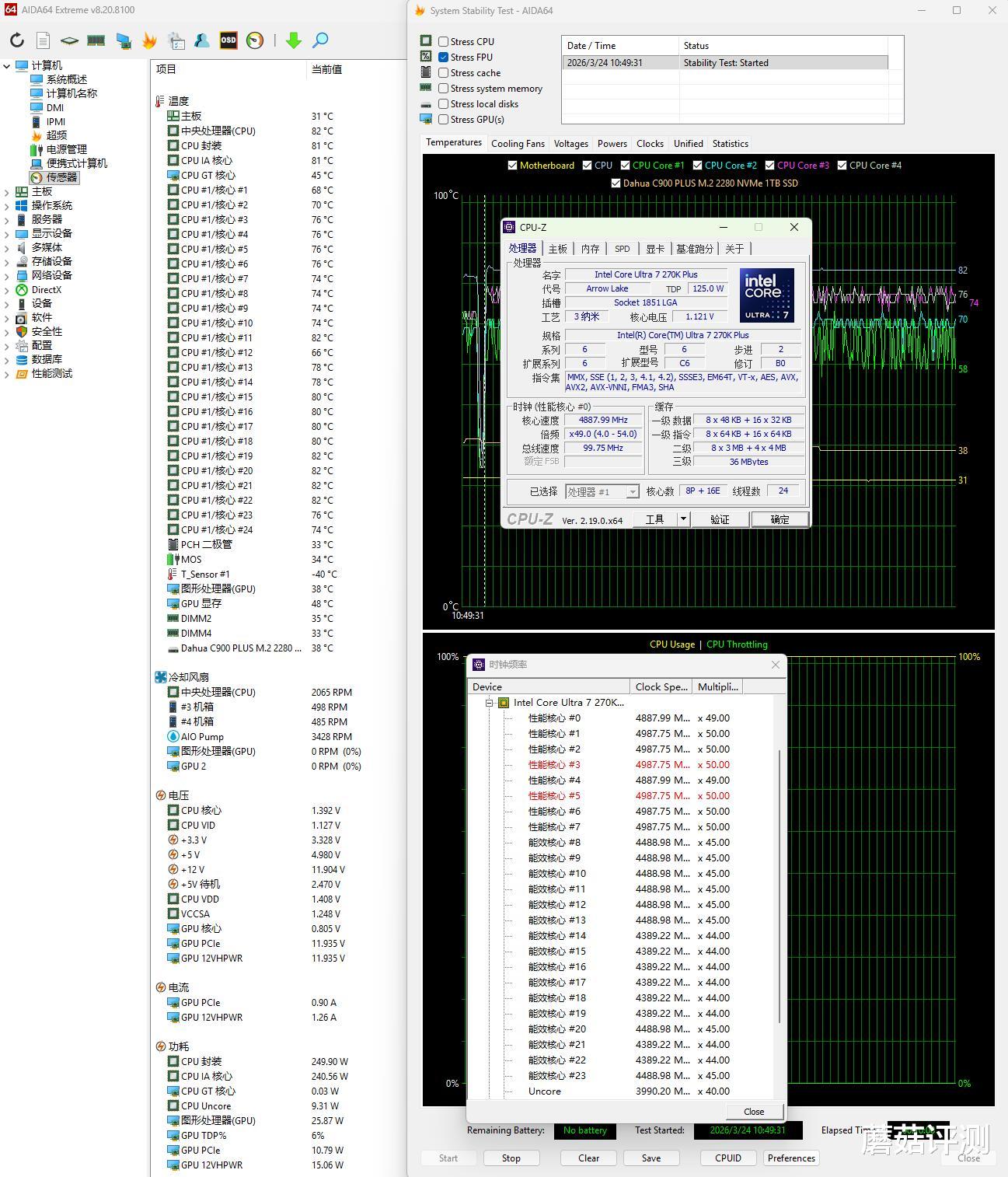 ▼单烤FPU测试5分钟,处理器功耗在250W左右,P核睿频5GHz,E核睿频4.5GHz,温度在82℃。供电Mos传感器温度在33℃左右。