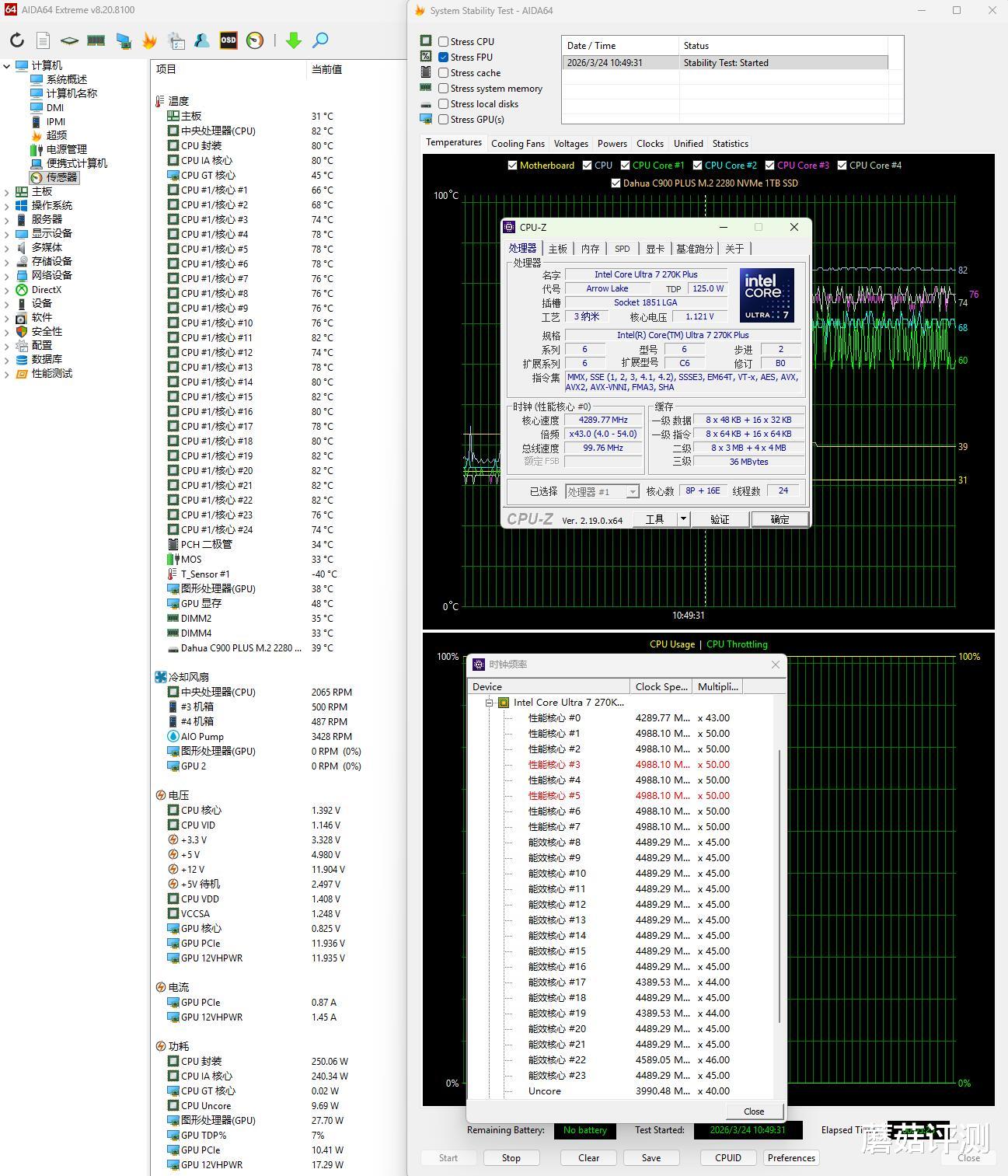 ▼跑个CPU-Z的压力测试,功耗在250W左右,P核睿频5.4GHz、E核睿频4.7GHz,温度在81℃左右。