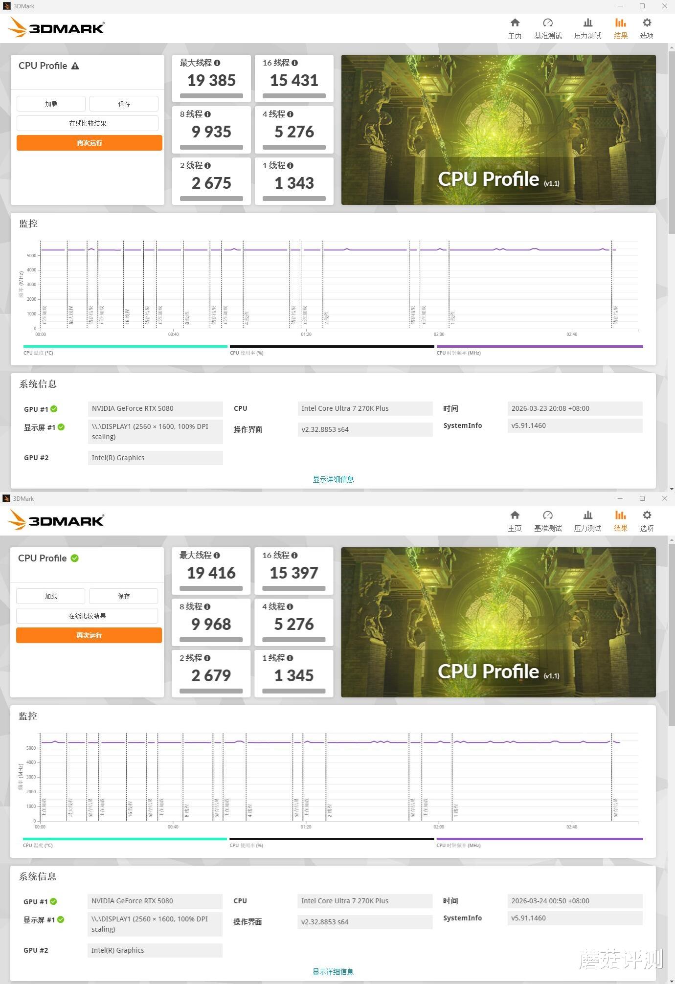 ▼跑个3Dmark的CPU测试,1线程从1343提升到1345,8线程从9935提升到9968,最大线程从19385提升到19416。