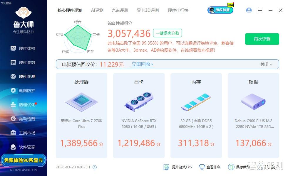 ▼再跑一下鲁大师的整机测试,处理器单独得分方面,从138.9W提升到140.8W,提升了2W左右。