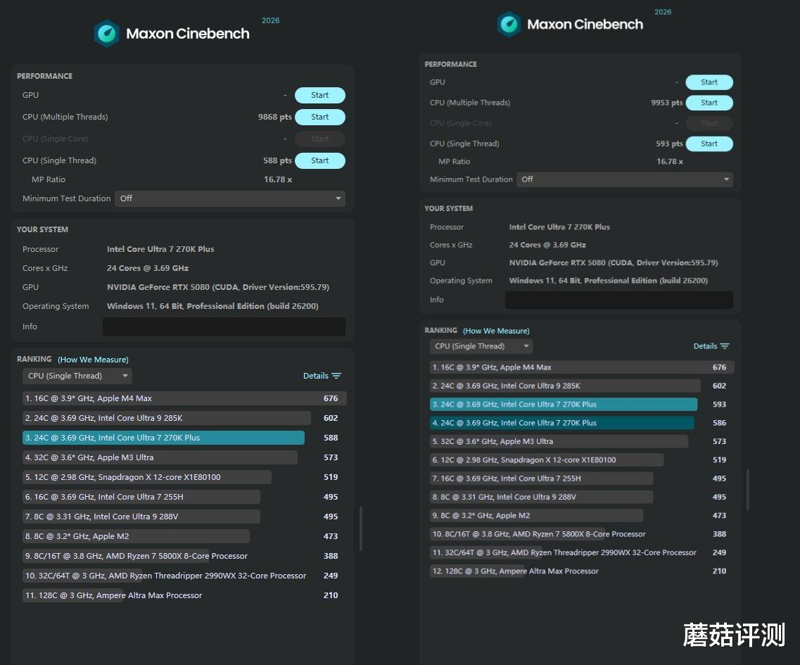 ▼跑个CineBench 2026,单核从588提升到593,多核从9868提升到9953。