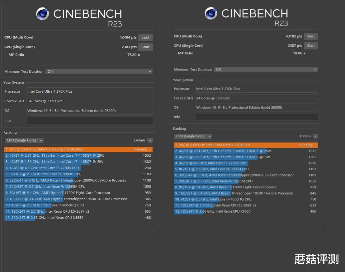 ▼跑个CineBench R23测试,单线程得分从2383提升到2387,多线程得分42404提升到43102。