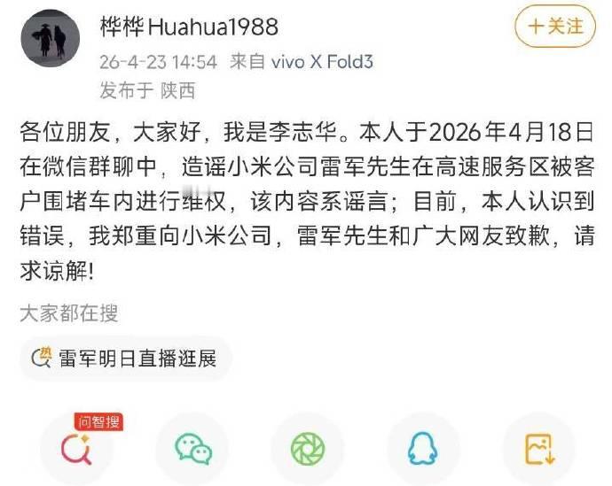 【小米公司报警】 博主因造谣小米被行拘10日 4月26日,发文表示: