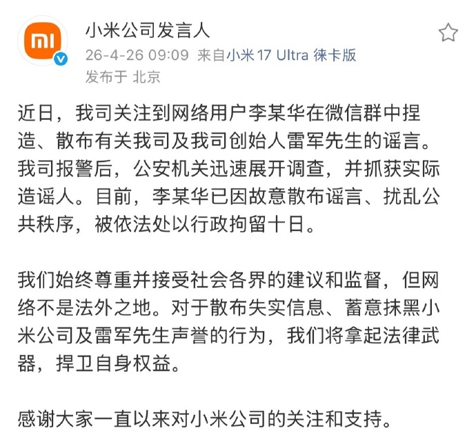 近日,我司关注到网络用户李某华在微信群中捏造、散布有关我司及我司创始人雷军先生的谣言。我司报警后,公安机关迅速展开调查,并抓获实际造谣人。目前,李某华已因故意散布谣言、扰乱公共秩序,被依法处以行政拘留十日。