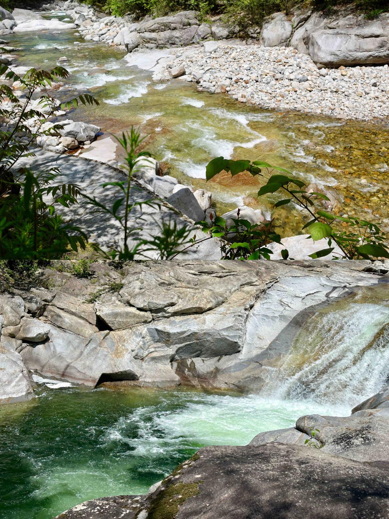 坐景区观光车到龙吟峡终点,约10公里,车程约30分钟。里面的生态环境非常好,一路溪水潺潺,植被繁茂,山上粉色的高山杜鹃开得正艳。沿途有很多山里民居,还有好几座吊桥,宛若世外桃源一般。