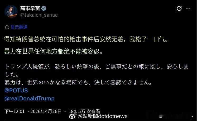 就在刚刚,高市早苗就白宫晚宴枪击事件表态了!
