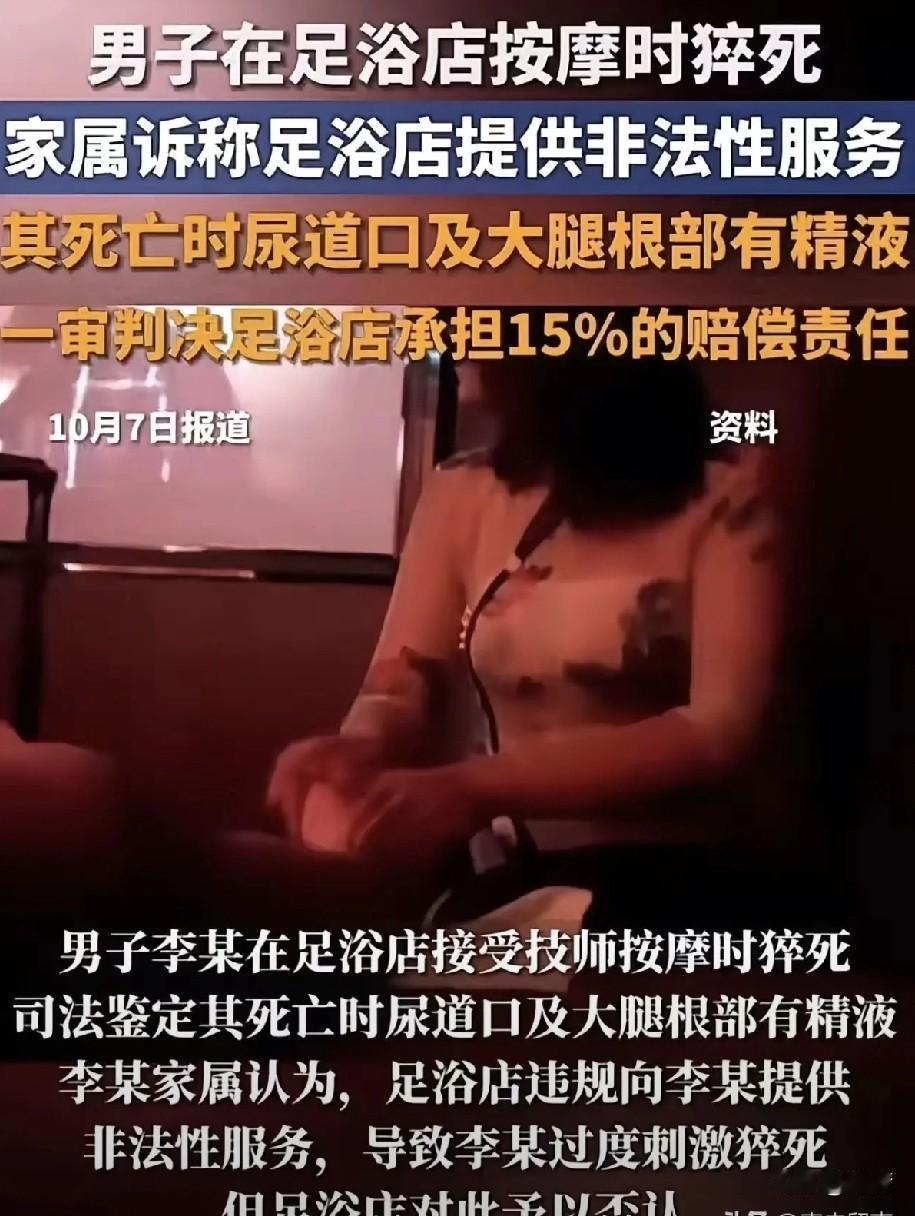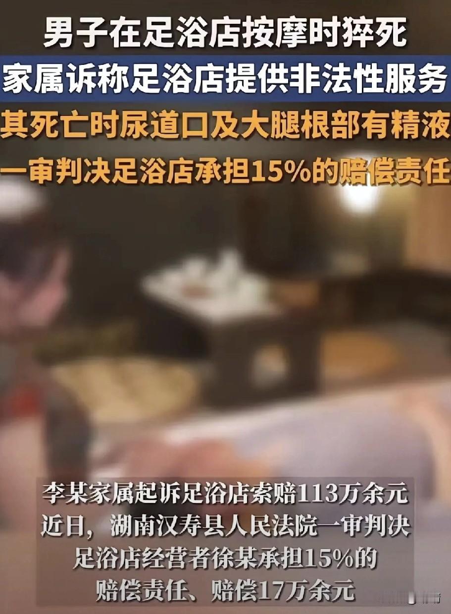 2025年3月19日,湖南省汉寿县发生一起令人唏嘘的事件,一名叫李某的男子在足浴店里进行按摩时猝死了,随后被送往医院抢救,医院方面确认死因是主动脉夹层破裂,李某家属认为足浴店提供的按摩服务有非法性行为,导致李某发生猝死,于是索赔113万余元。