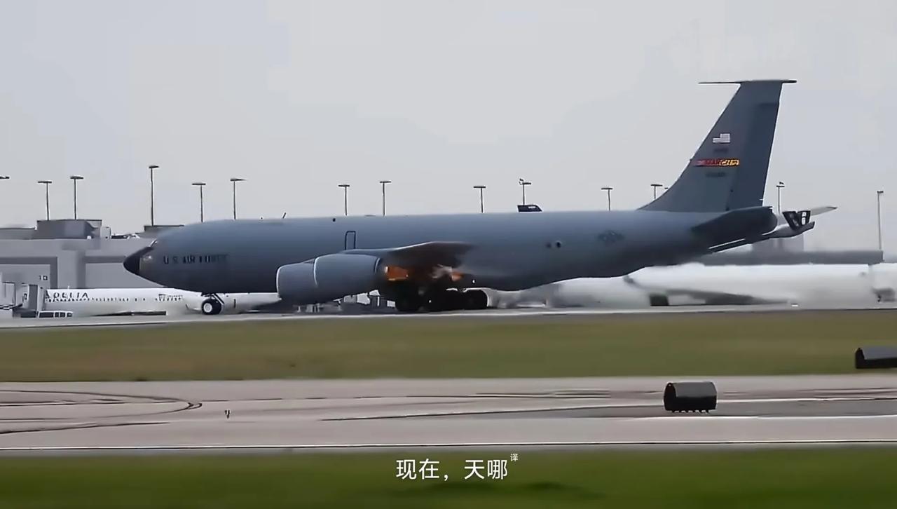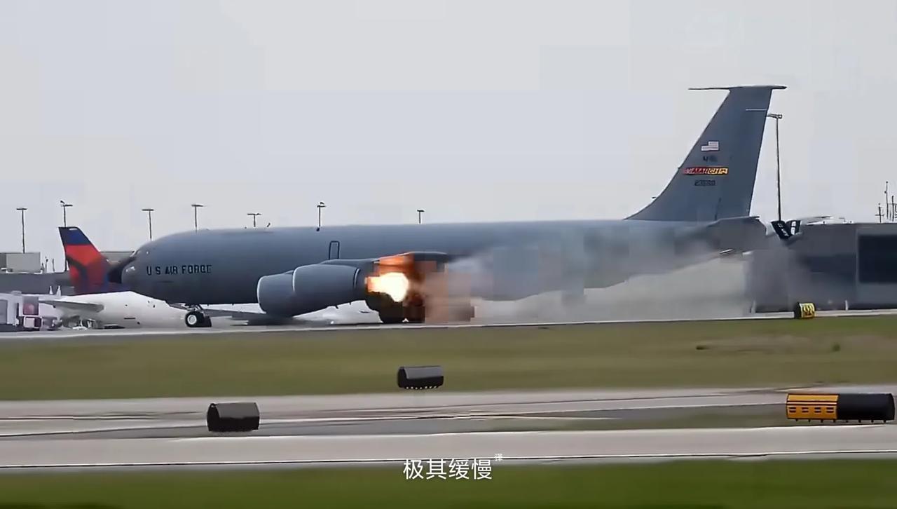 美国空军KC-135R加油机从亚特兰大起飞滑跑时,左侧发动机突然呼呼往外窜火。随后,这架KC-135R在跑道上停了下来。