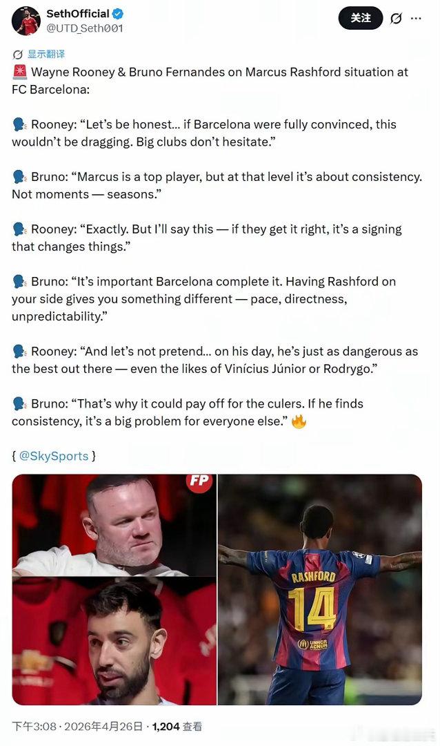 鲁尼和B费都看出了拉什福德的问题:状态不稳。鲁尼在专访B费时,专门聊到了拉什福德。鲁尼认为,巴萨没买断拉什福德,说明他们还在犹豫。而B费则谈了拉什福德如何才能稳定发挥,对巴萨能有多大贡献。拉什福德刚进曼联一线队时,鲁尼是队长;他离开时,B费成了队长。两位队长都承认,拉什福德状态不稳。那么,一个正值巅峰的球员,为何还会这样?是不是该看看他的纪律性和场外生活了?足球