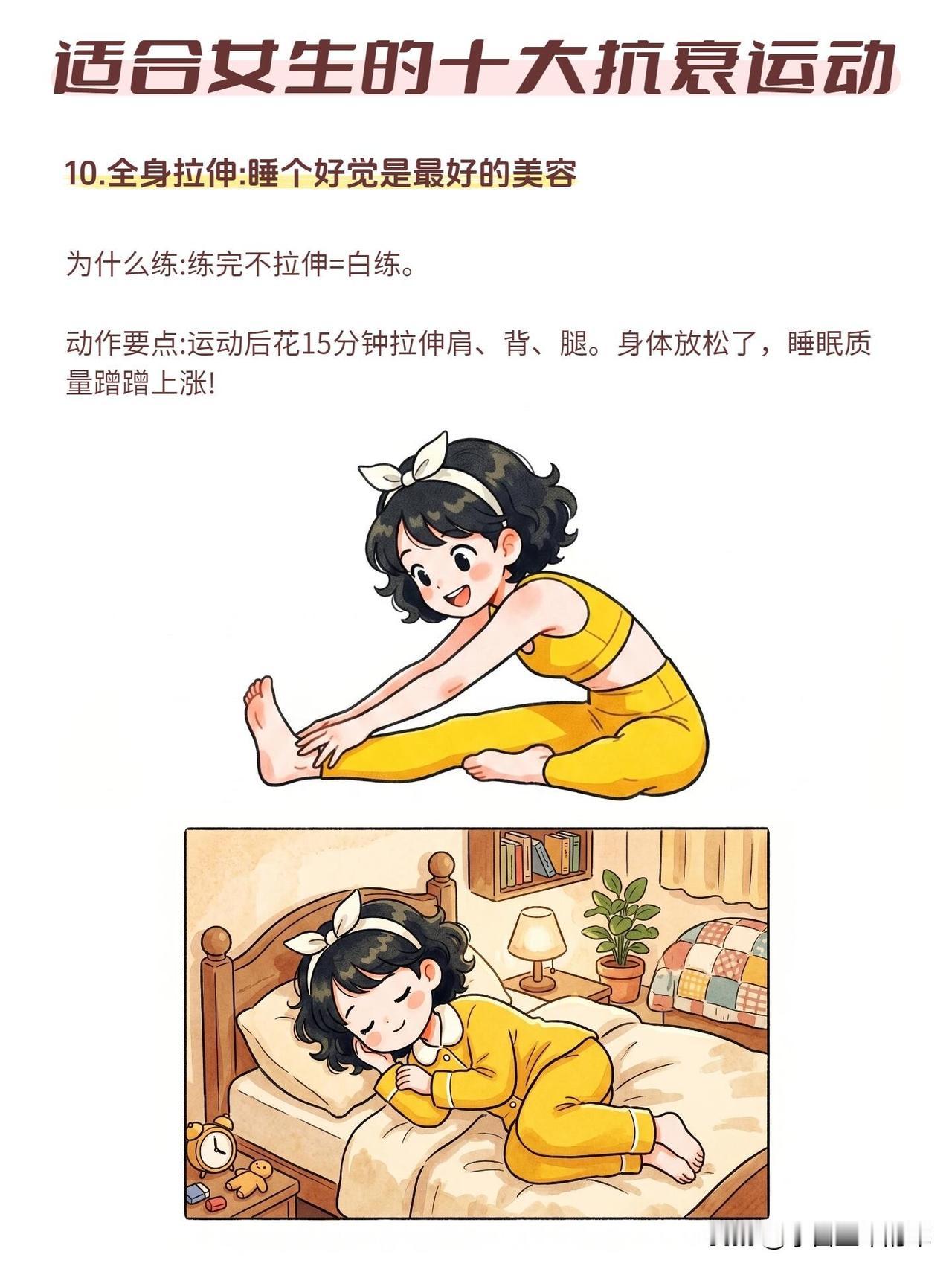 10. 全身拉伸:运动后花15分钟拉伸肩背和腿部,放松肌肉,还能改善睡眠。