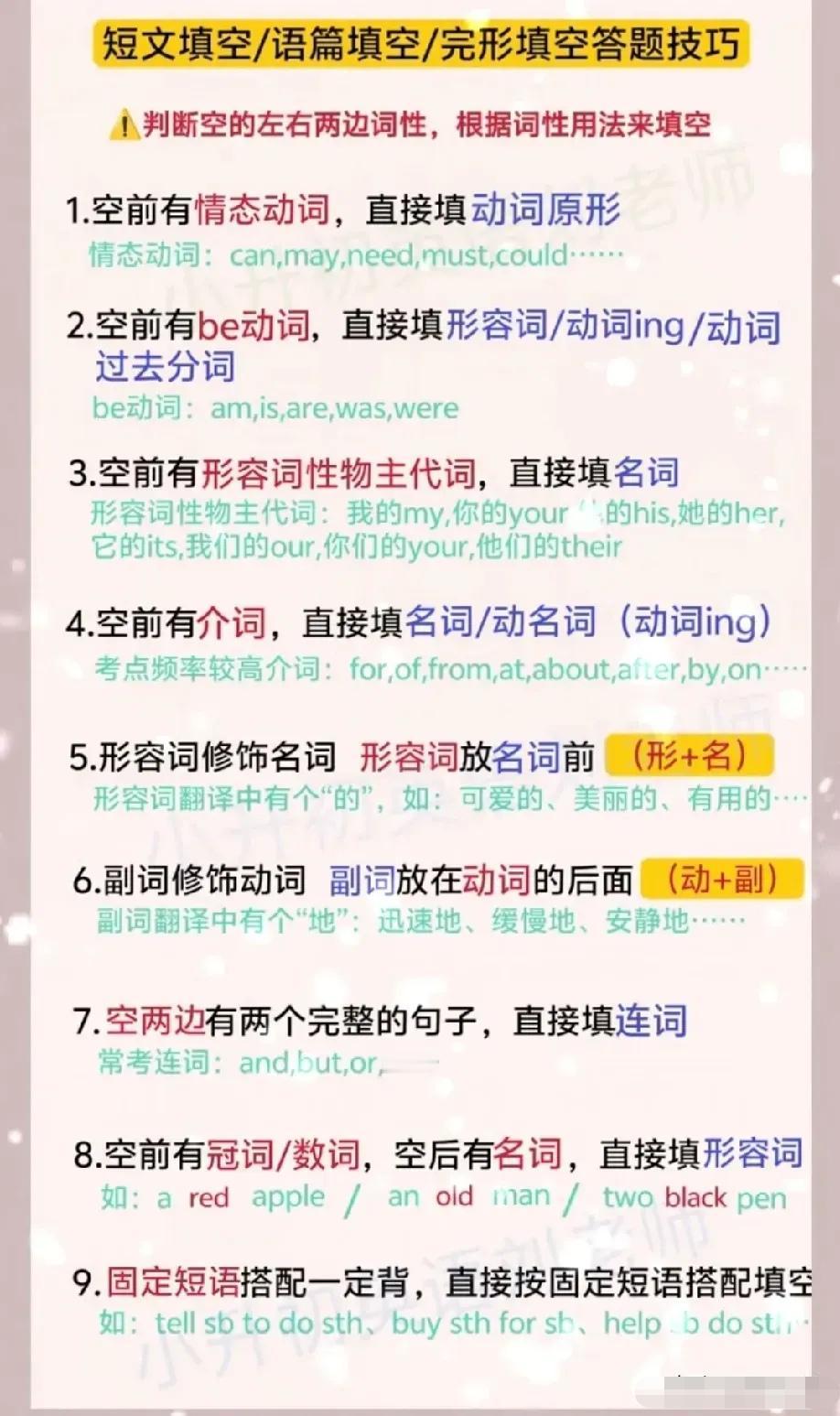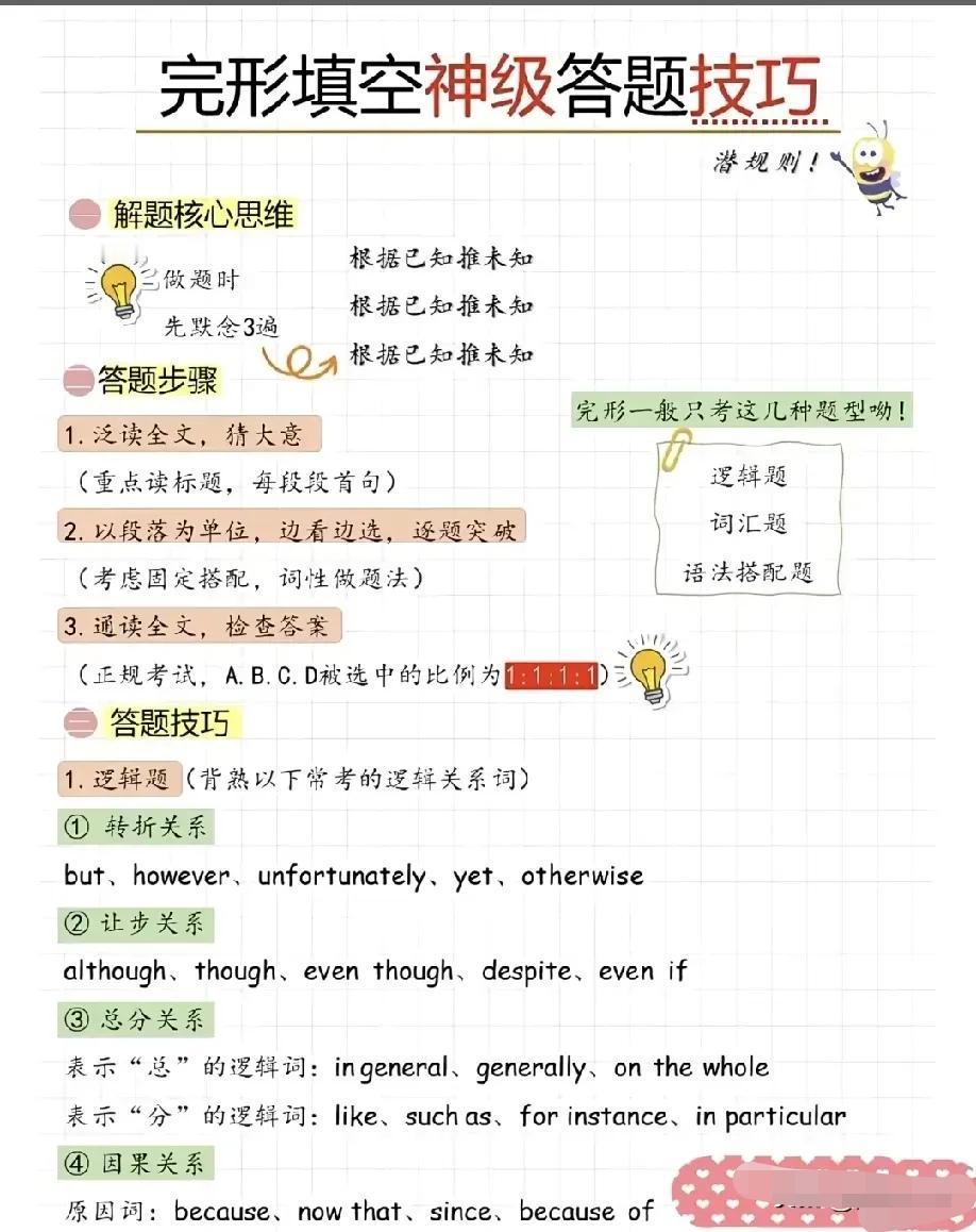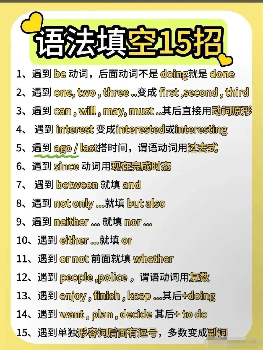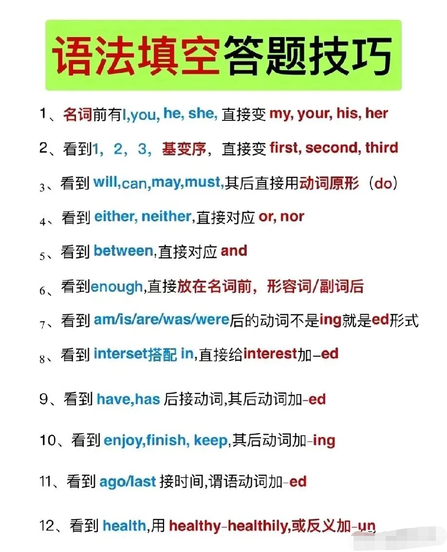 语法填空有妙招,顺口溜直接封神:“名词不裸奔,介词后doing,情态后原形,than现比较级,and前后要一致”。有提示词看词性,无提示词优先冠介连代,掌握规律轻松拿满分。