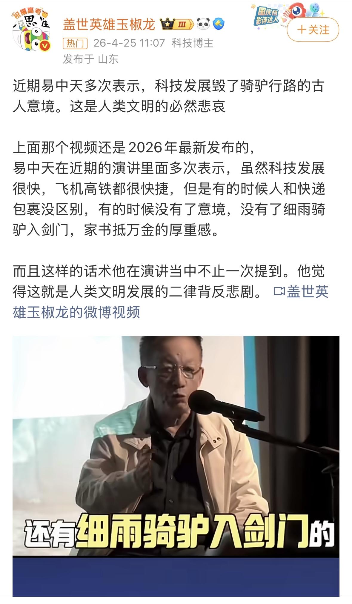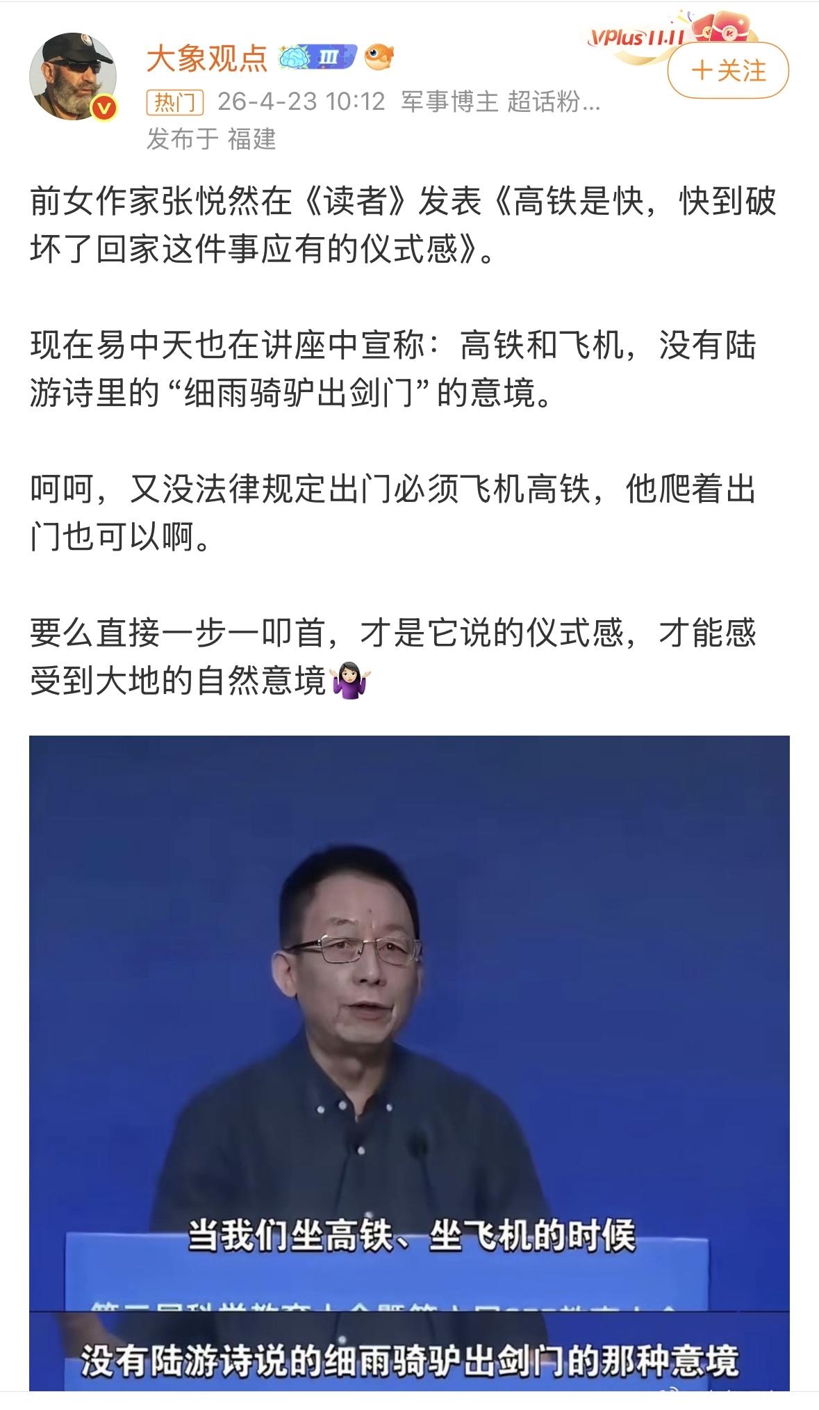 中国人确实有些人脑子出问题了,没有骑驴出剑门,不是被驴踢的,可能是被铁轨磕破头了!你坐高铁去成都,能坐出细雨骑驴出剑门的意境?这些人大概没有去过剑门关,也没有走过金牛古道,坐高铁风吹不着,雨淋不着,在原野奔驰,怎么可能和骑驴走狭窄山路一个感觉?你听到的,只是啤酒资料八宝粥,花生瓜子矿泉水,快餐盒饭,有需要的乘客看一下了,最后一圈了!去年我32天走了法国西班牙800公里朝圣之旅,今年又7天在尼泊尔走ABC和布恩山,总共踩73公里,也有直升机两个小时就下山来了,那能一样吗?我确实准备走一趟金牛古道,据说当地已经推出了这个项目,愚蠢的人真多!