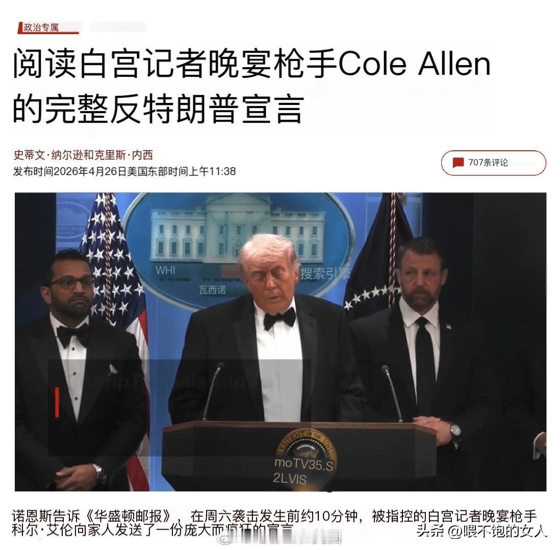 呵呵!特朗普真是躲过一劫啊,命真大,真的,我刚才全部了解了一下这个白宫记者晚宴枪手作案目标,可能就是特朗普,因为美国媒体已经暴露出来了。