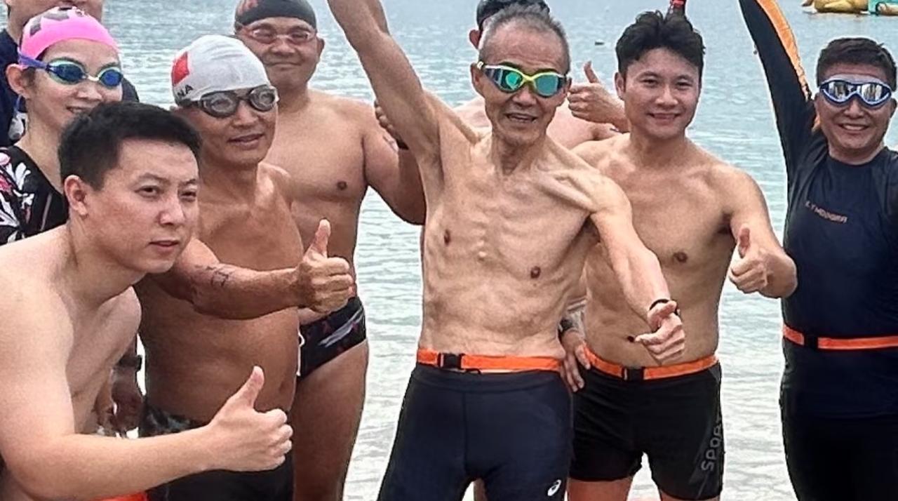 75岁王石来现身大梅沙,这个岁数还在大方秀肌肉,身边还围着一堆人。