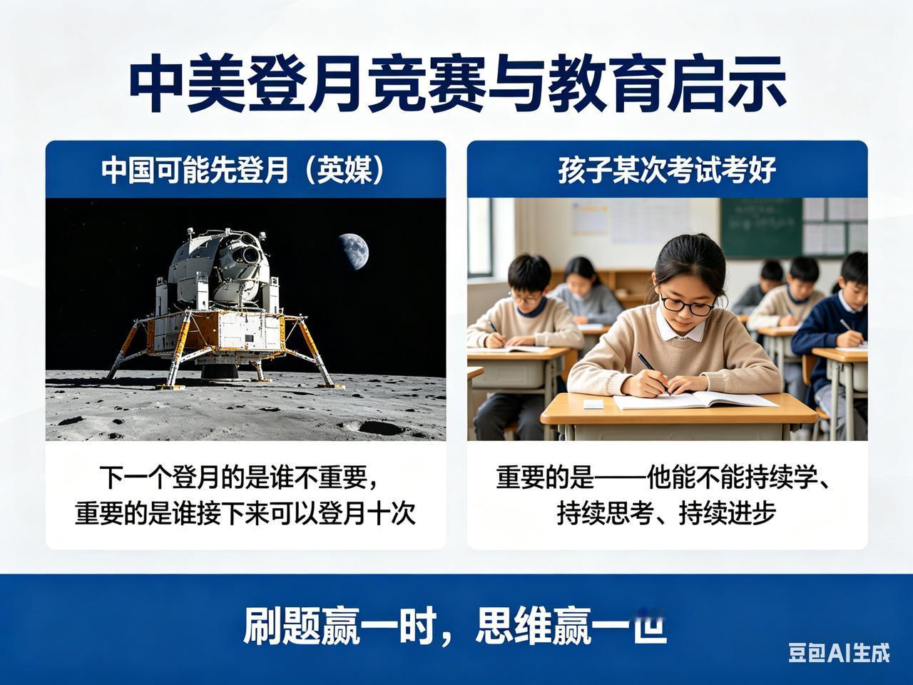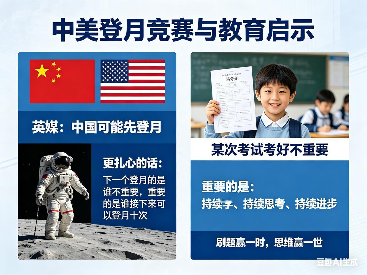 中美登月竞赛,英媒说中国可能先到。 但有句话更扎心—— “下一个登月的是谁不重要,重要的是谁接下来可以登月十次。” 教育也一样。 孩子某次考试考好了,不重要。 重要的是——他能不能持续学、持续思考、持续进步。 刷题赢一时,思维赢一世。
