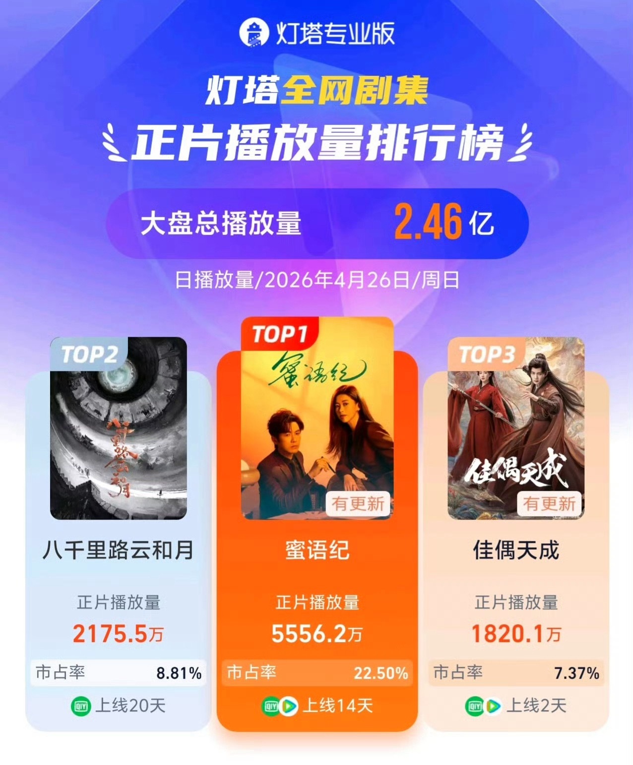 任嘉伦《佳偶天成》4月26日剧集v指76.23登顶top1陆千乔角色v指8.52
