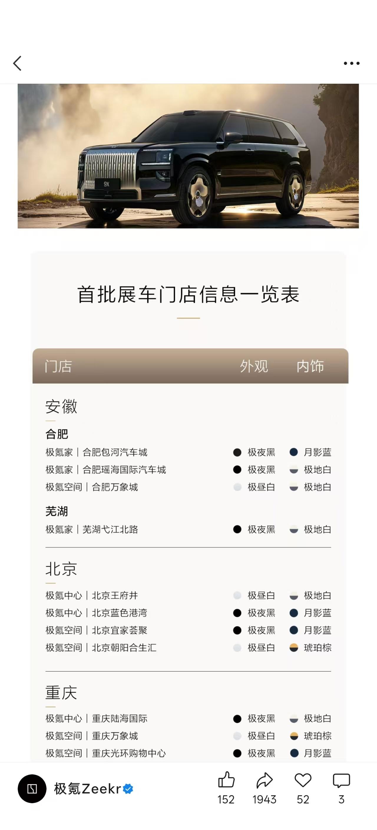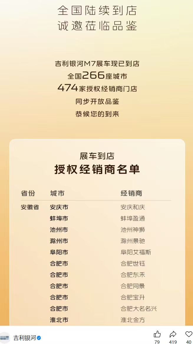 对比传统品牌(银河仅做对比,没有拉踩的意思)的展车到店海报,只细化到经销商名称层级,展厅位置、具体展车信息等则完全不体现