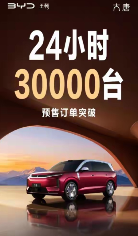 比亚迪大唐开启预售24小时,订单突破3万台。这是妥妥的爆款车型啊!