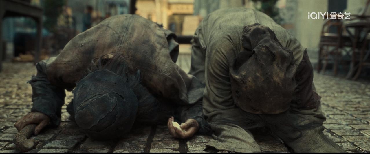 他们已经沦为了街边乞丐,衣着肮脏褴褛,正在和其他乞丐争抢食物。