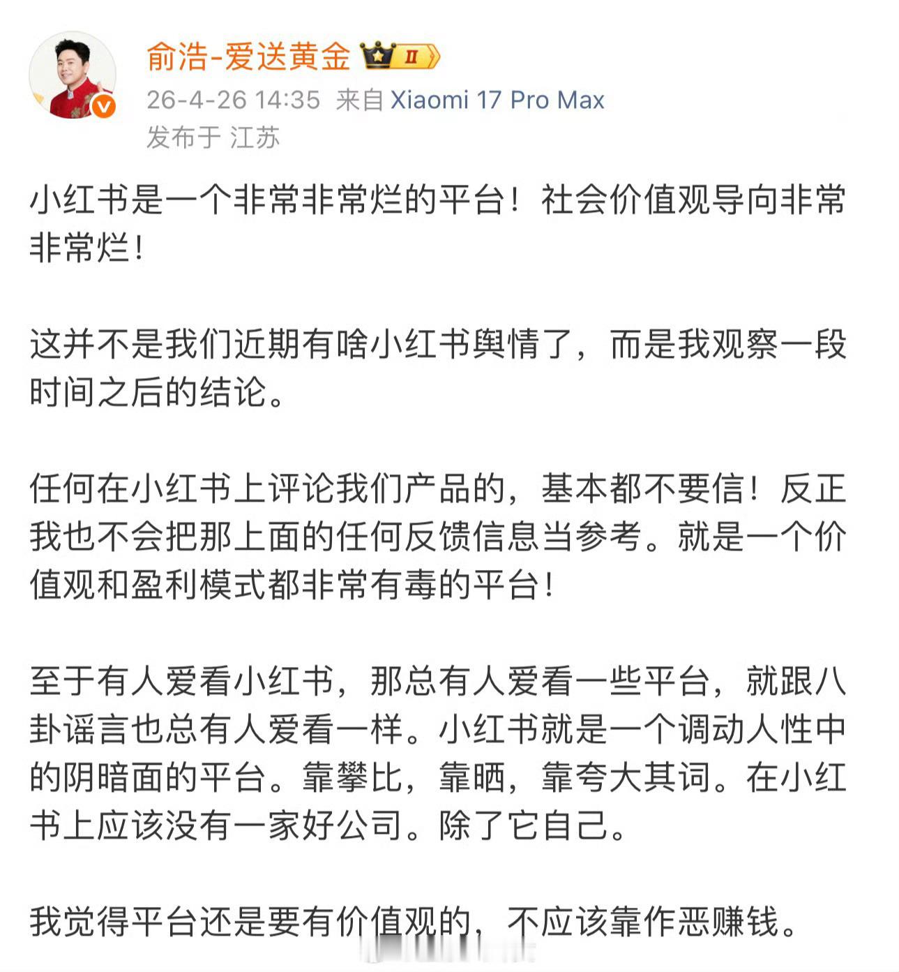 追觅俞浩怒批小红书哈哈,好骂!小红薯现在乐色信息确实挺多的,我觉得好骂,不是因为认同他这个人,而是我作为一个天天刷红薯的普通用户,真的被那些一模一样的话术、一惊一乍的标题、滤镜厚到妈都不认识的照片烦透了。