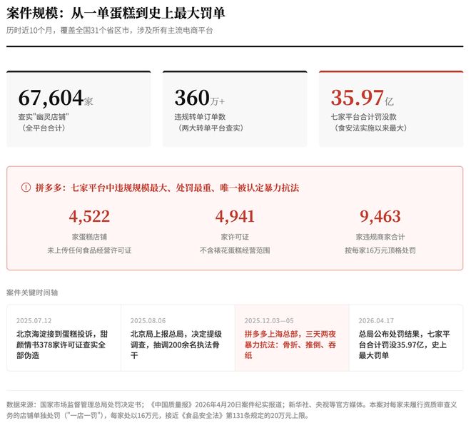 2025年8月,市场监管总局提级调查,从全国抽调200余名执法骨干组成专案组,最终查实"幽灵店铺"67604家、违规转单超360万单,拼多多、美团、京东、饿了么(淘宝闪购)、抖音、淘宝、天猫七家平台全部涉案。