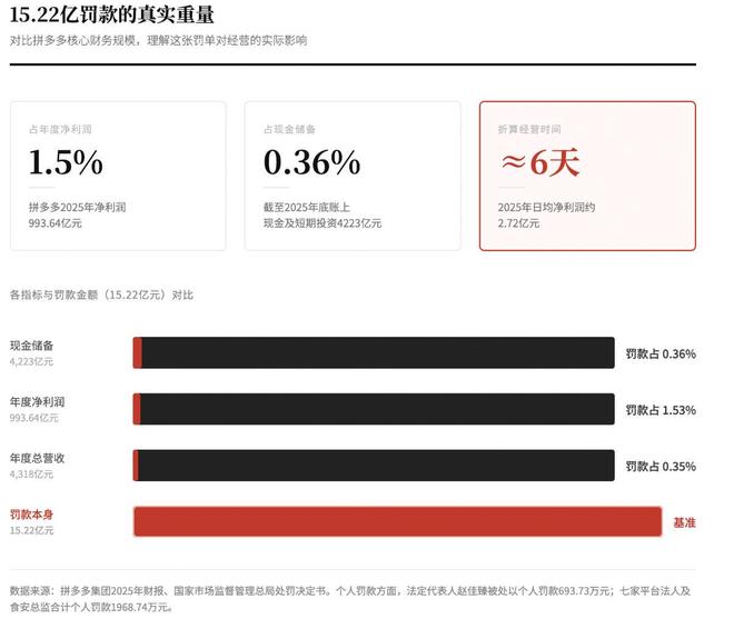 其二是体量催生的幻觉。2025年全年,拼多多营收4318亿元,净利润993.64亿元,账上现金储备超过4223亿元。15.22亿元的罚款,是其净利润的约1.5%,是其现金储备的0.36%,不足一周利润。这种规模在内部容易形成一种判断:罚款不过是运营成本,法律风险是可以量化的因子,监管只是可以用资源去博弈的一场谈判。