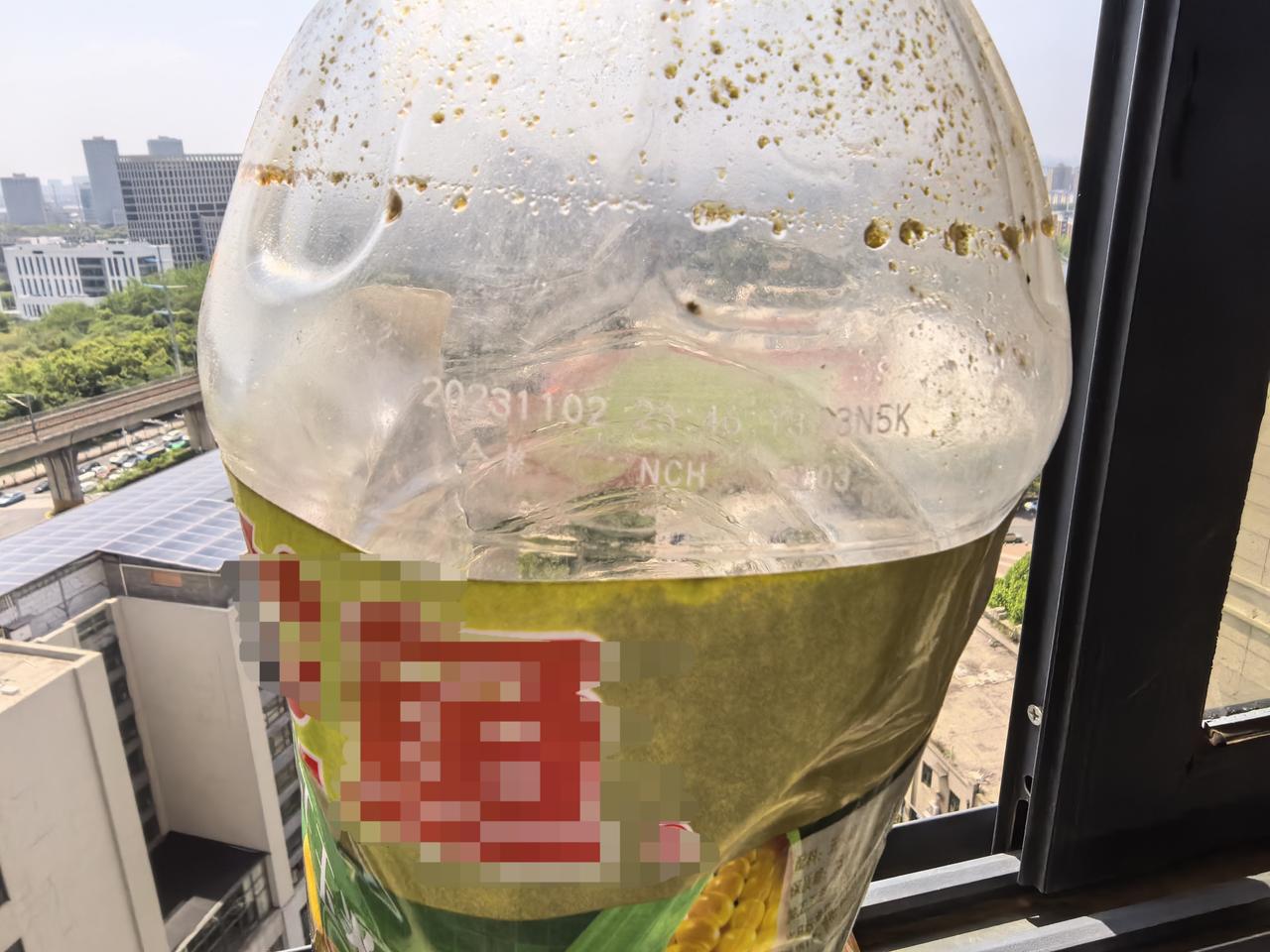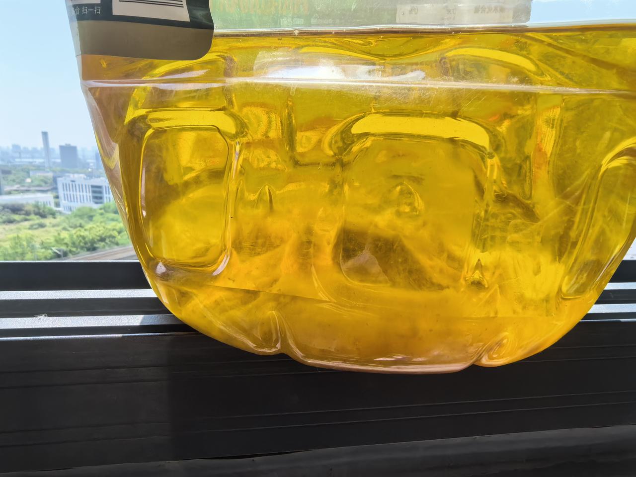周日打扫厨房卫生,发现橱柜里有一壶没有用完的油(是某品牌的纯正玉米油)。提出来看了一下,发现底部有很多絮状的沉淀,吓了一跳。
