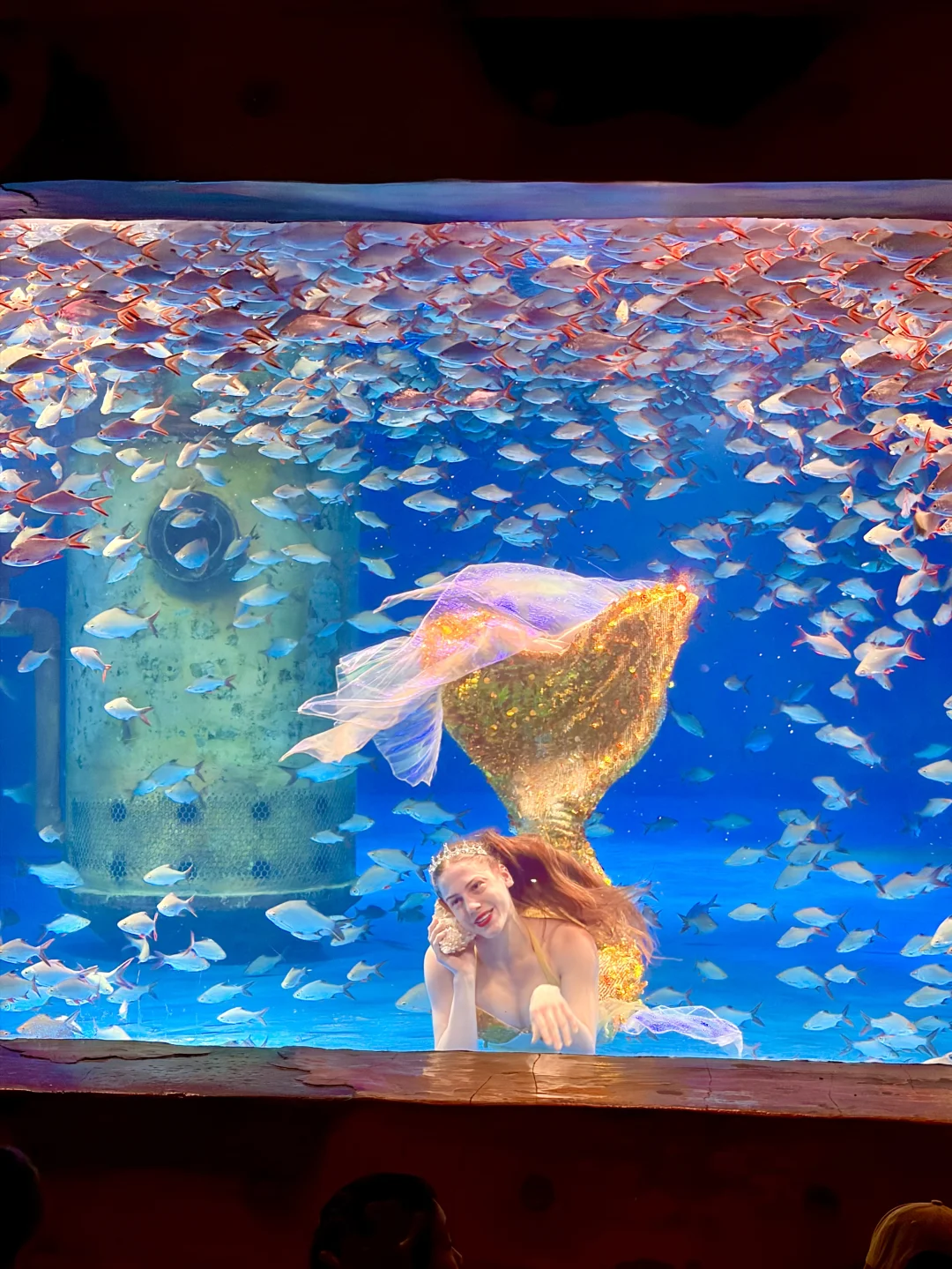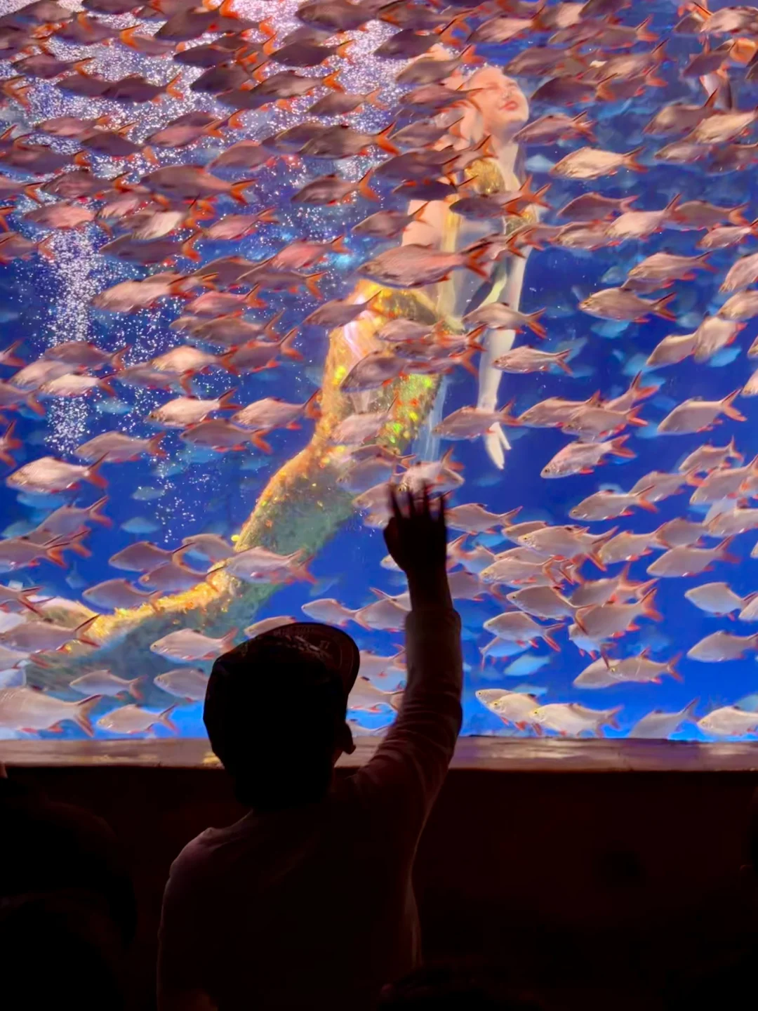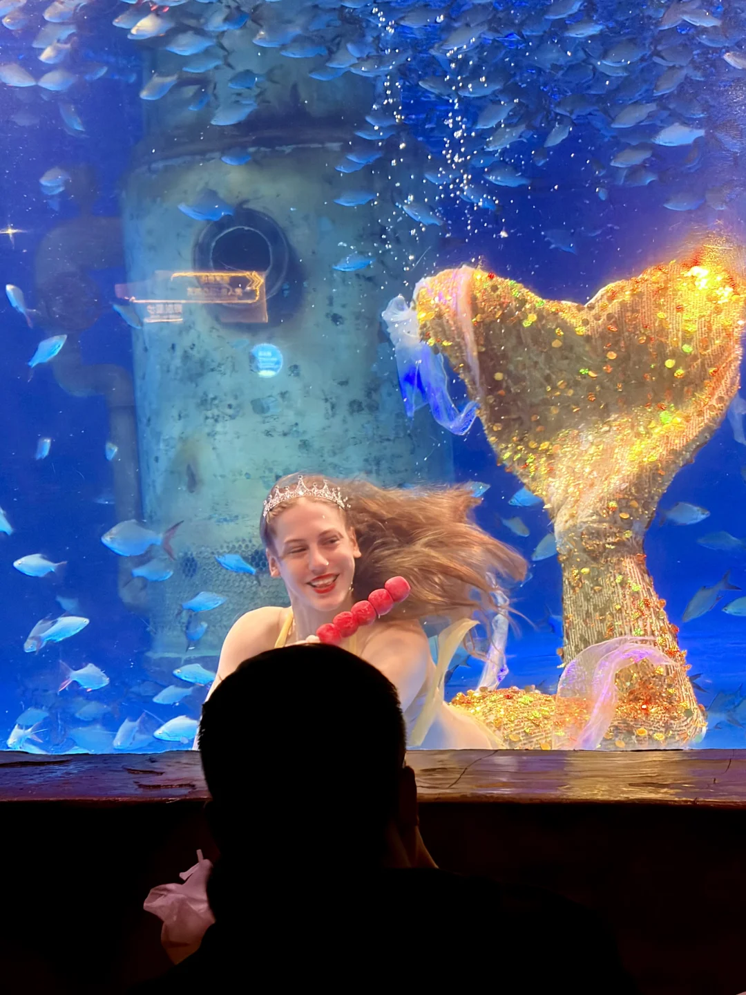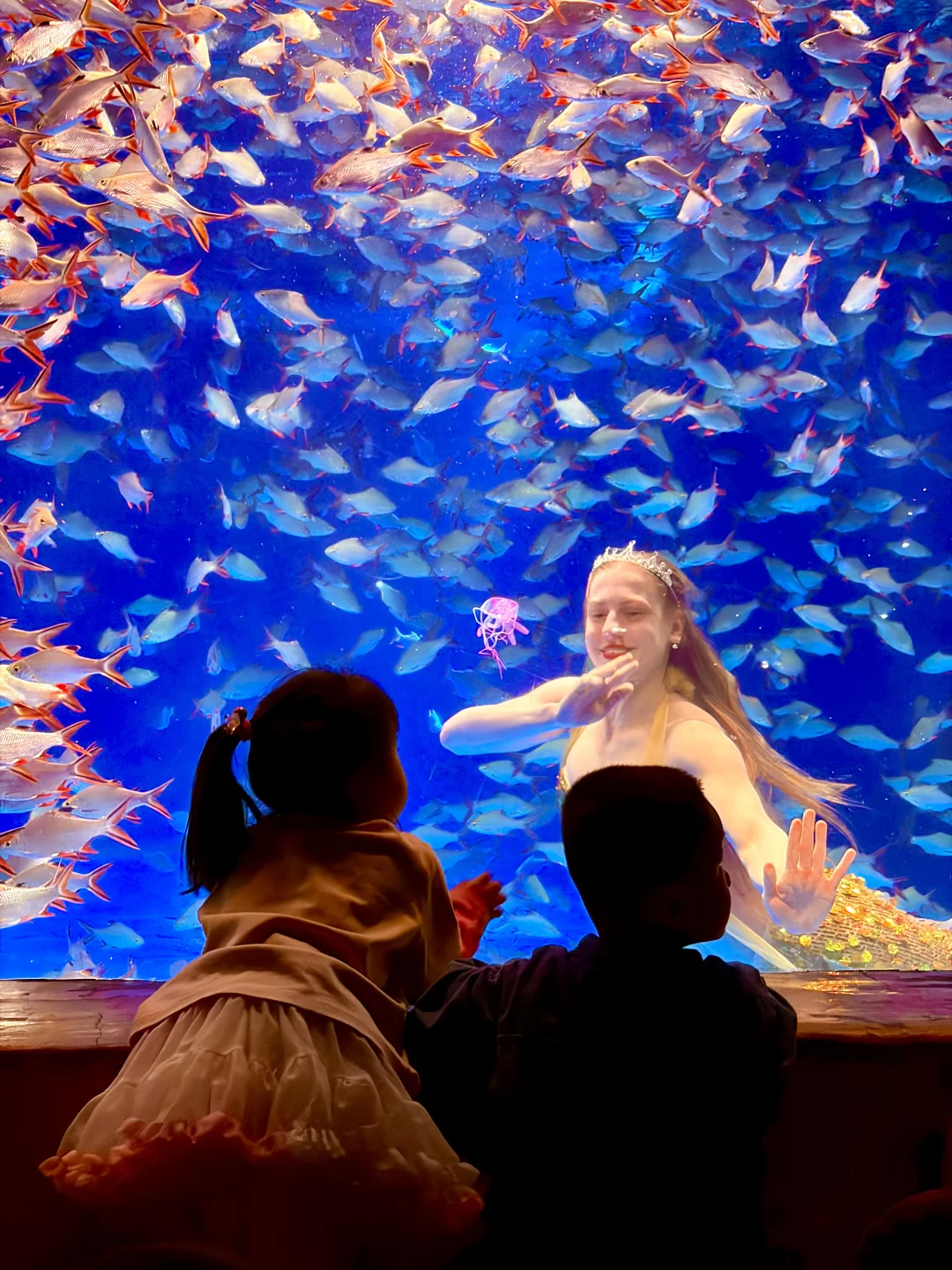 旁边海底秀场,美人鱼🧜♀️跟着鱼群一起舞蹈,小朋友们一脸惊喜,全程目不转睛地着。