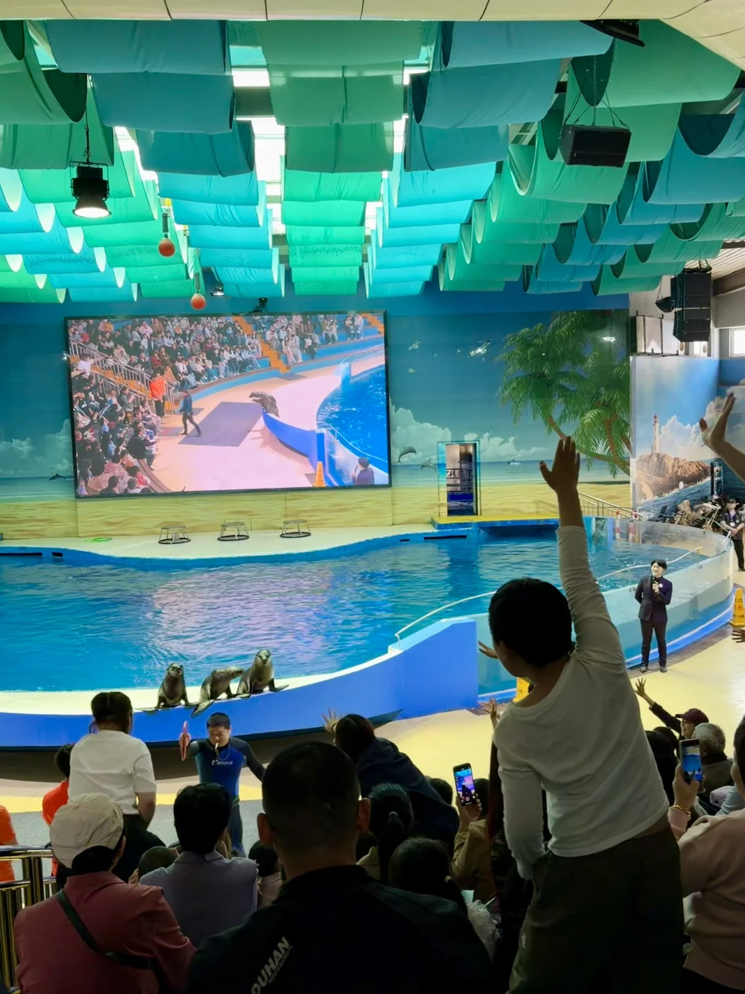 海狮海豚互动:不要错过,现场热烈,小孩哥还积极举手想,想和海狮互打动,全程目不转睛,欢呼声不断。