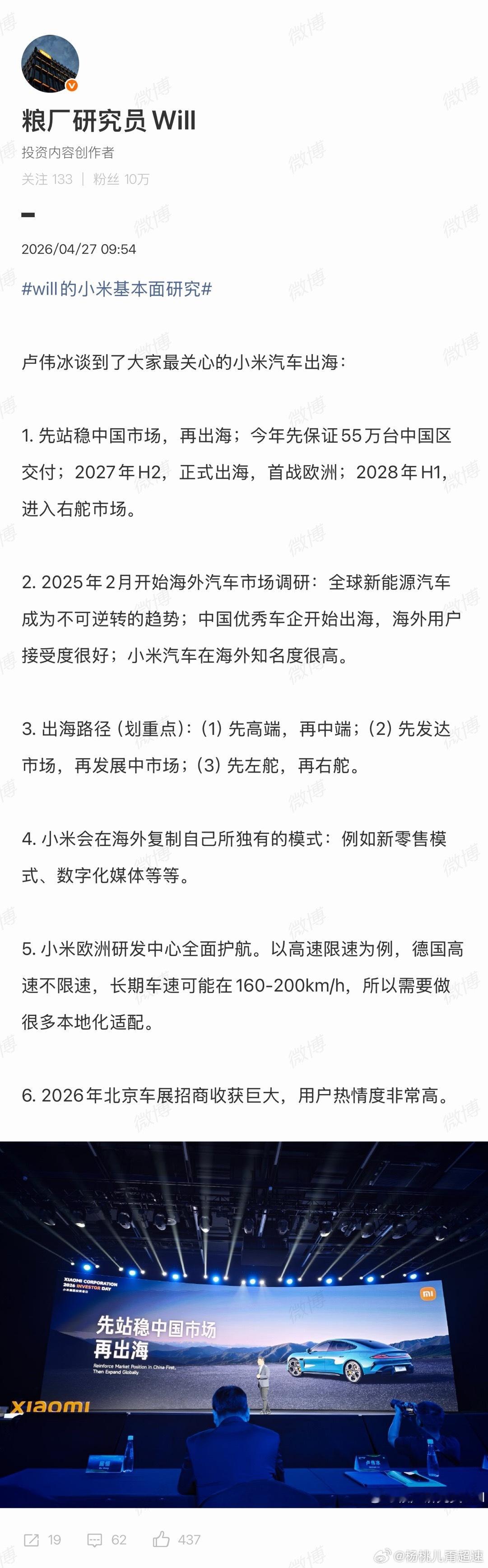 小米汽车拟明年出海现在汽车市场 品牌多 车型多看参数配置 甚至是外观尺寸都同质化高可利润极低 销量也不尽如人意所以越来越多的车企在“卷”出口这事儿很多车型已经成了全球车,在国外的销量很高小米也准备先站稳中国市场,再出海,今年先保证55万台中国区交付。2027年H2,正式出海,首战欧洲。2028年H1,进入右舵市场。至于出海路径:(1)先高端,再中端;(2)先发达市场,再发展中市场;(3)先左舵,再右舵。小米会在海外复制自己所独有的模式:例如新零售模式、数字化媒体等等。