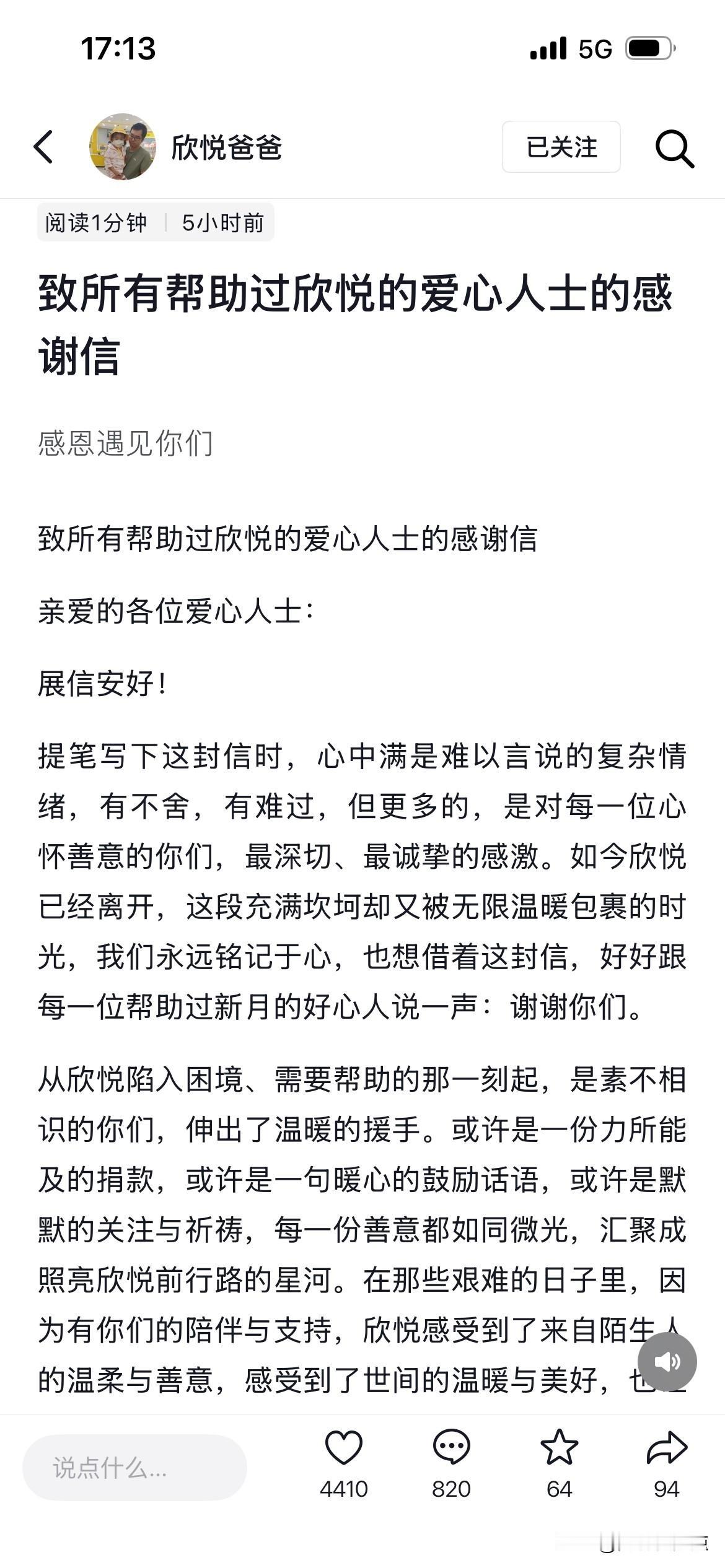侯健爸爸的心里得有多痛啊……看他给所有帮助过欣悦小宝贝的这封信,我总感觉要写点什么,甚至我很有必要向他郑重地道一个歉。