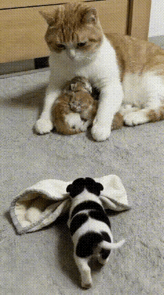猫妈妈也特别温柔,接过毯子轻轻盖在两只小猫身上,还亲昵地嗅嗅小狗,满满的感激都藏在小动作里。从来不用语言表达的它们,却把善良和温柔展现得淋漓尽致。