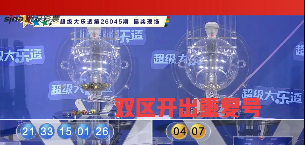 大乐透第26045期开奖结果揭晓,当期开奖号码是:01-15-21-26-33+04-07,前区开出全奇数龙头凤尾形态,后区开出一小一大的组合,并且双区均出现了一个重复号。