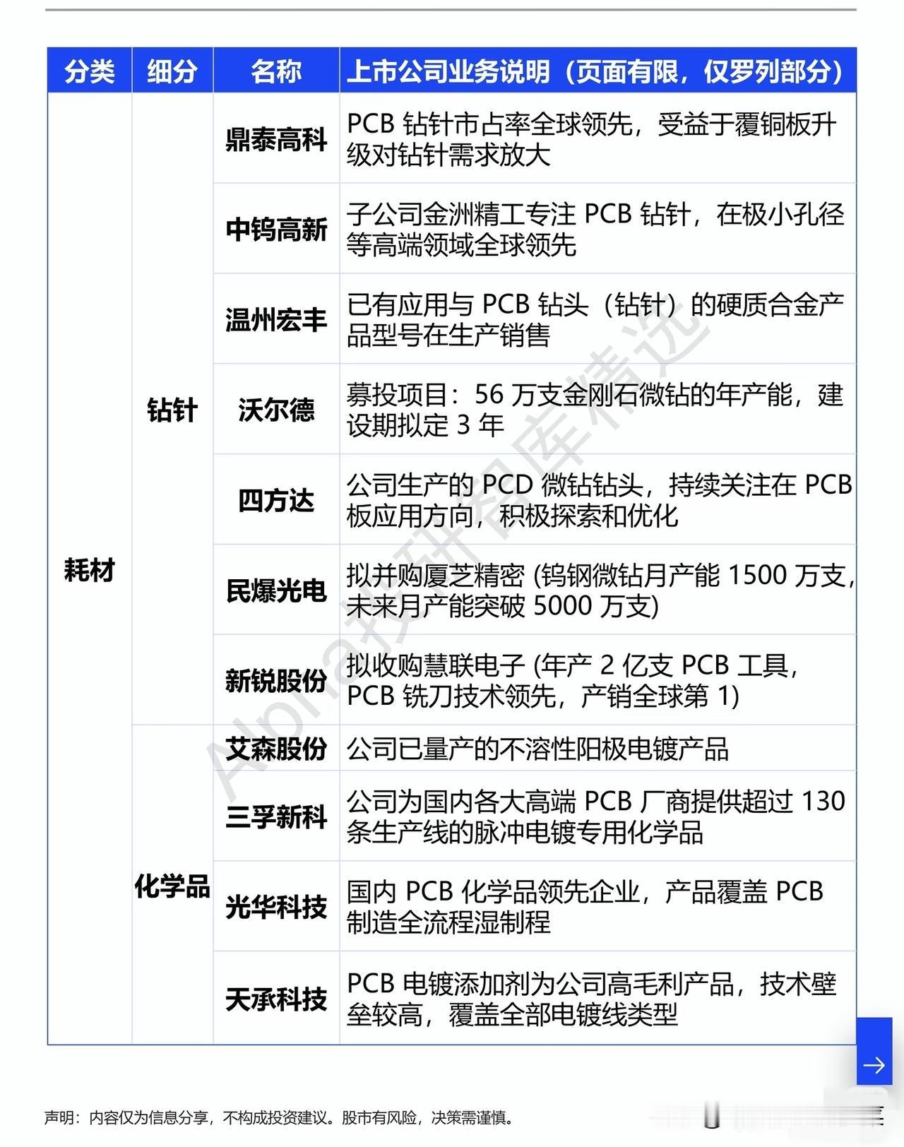 化学品:光华科技、天承科技、三孚新科等企业,产品覆盖PCB湿制程全流程,电镀添加剂等产品技术壁垒高,随高端PCB扩产持续放量,成为设备之外的又一重要增量来源。
