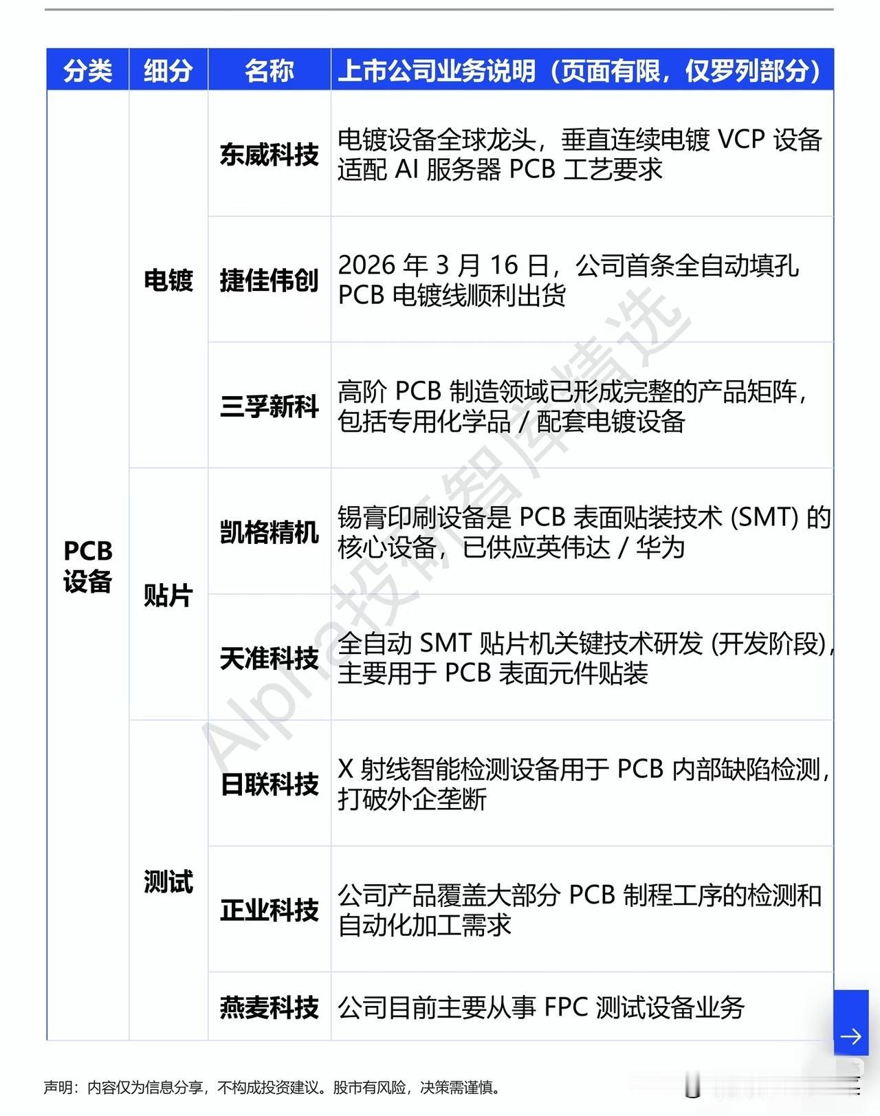 电镀/贴片/测试设备:垂直连续电镀(VCP)设备成为AI服务器PCB的标配,东威科技作为全球龙头,产品已适配AI服务器工艺要求;凯格精机的锡膏印刷设备已进入英伟达、华为供应链,成为SMT环节的核心供应商。
