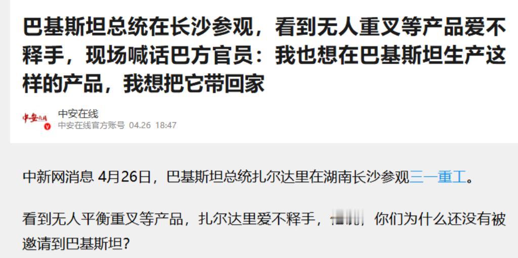 4月26日,巴基斯坦总统扎尔达里在长沙三一重工车间里“挪不动步”——一台能自己跑、自己搬货的无人叉车彻底“圈粉”了这位总统。他当场拍着巴方官员的肩膀表示:咱巴基斯坦也得造这个!我要把这技术带回家!这场景不仅让现场工作人员乐了,更折射出中巴工业合作从“修路建厂”转向“技术赋能”的新趋势。