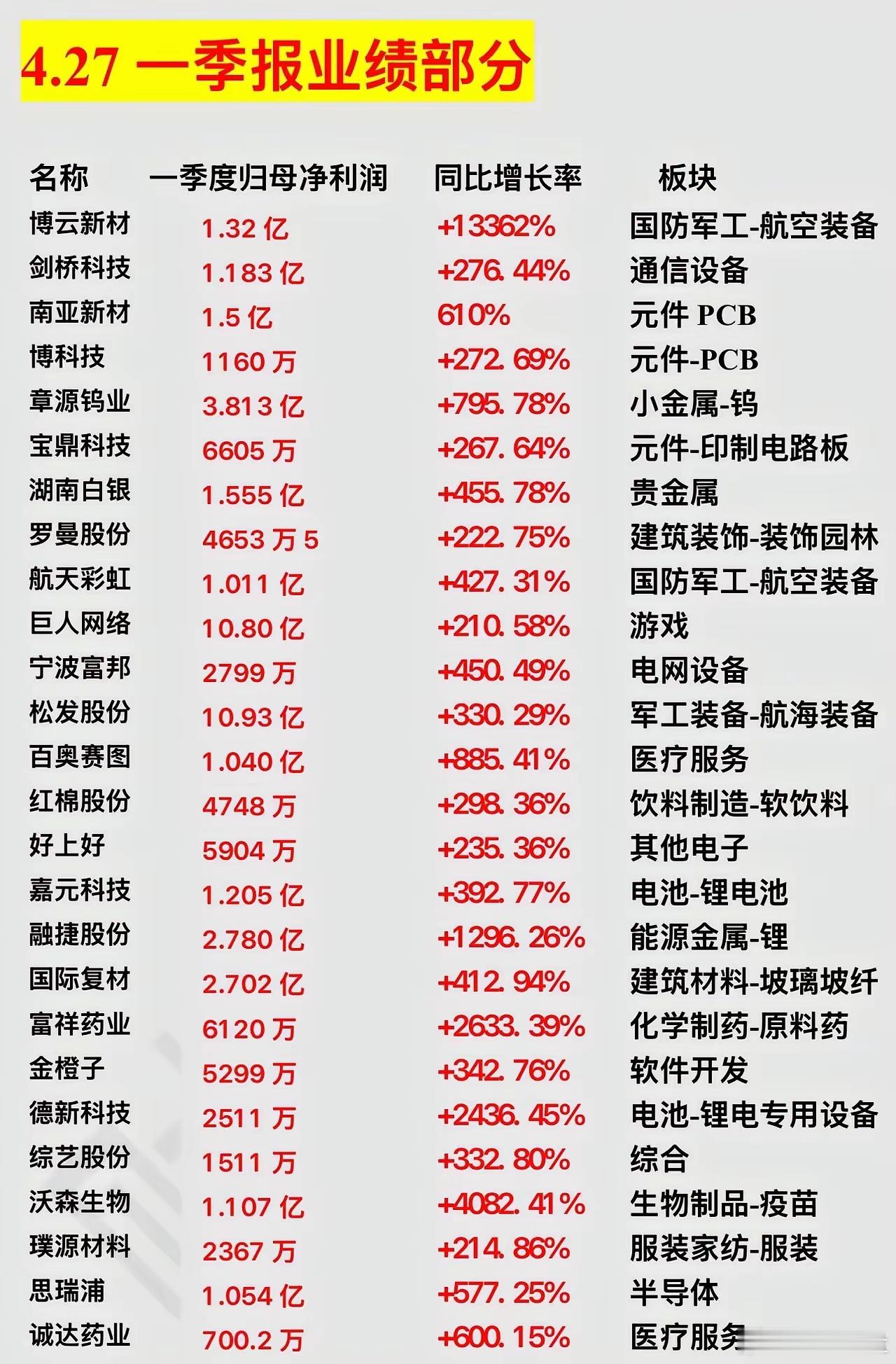4月27日公布的一季报业绩预增排行榜来了博云新材业绩一季报暴增13362%是怎么