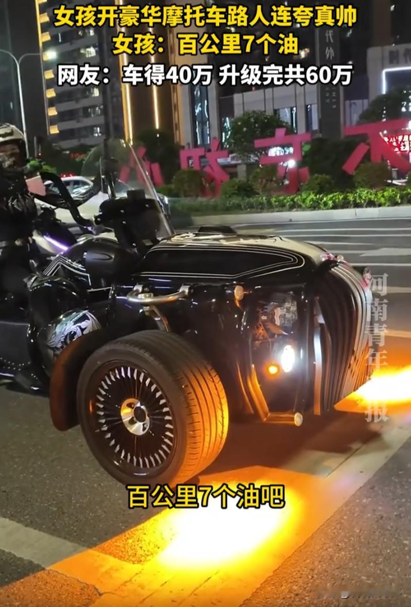 回头率拉满了!广东,一女子开豪华摩托上路,等红灯时直接把路人看傻眼了,长这么大,还是头一次看到车头两个轮子的摩托车,聊天中得知车子百公里七个油。有的网友却酸了